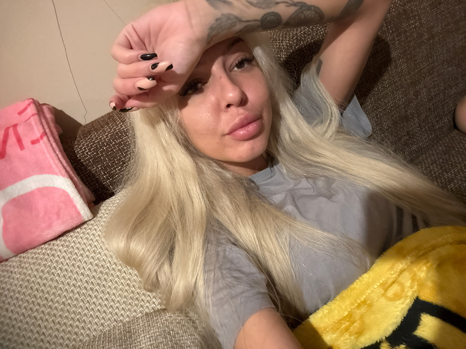 A woman with long blonde hair is lying on a sofa. She has tattoos on her arm and black nail polish. She is wearing a gray shirt. A pink and white blanket is on the left side of the sofa and a yellow b…read more