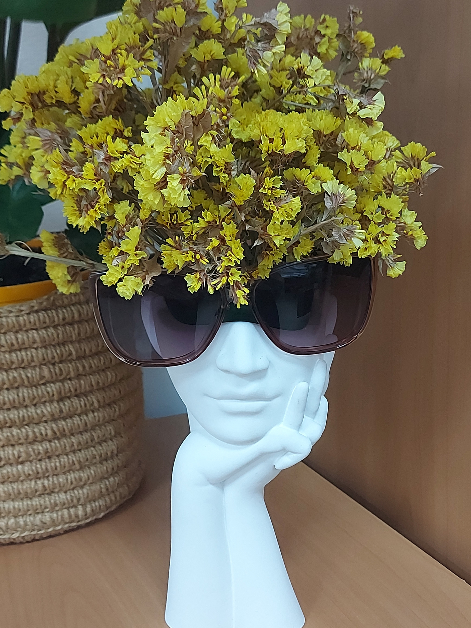 The image depicts a white plaster bust wearing sunglasses, with a bouquet of yellow flowers arranged around it. The bust and flowers are positioned on a brown woven basket, resting on a light brown wo…read more
