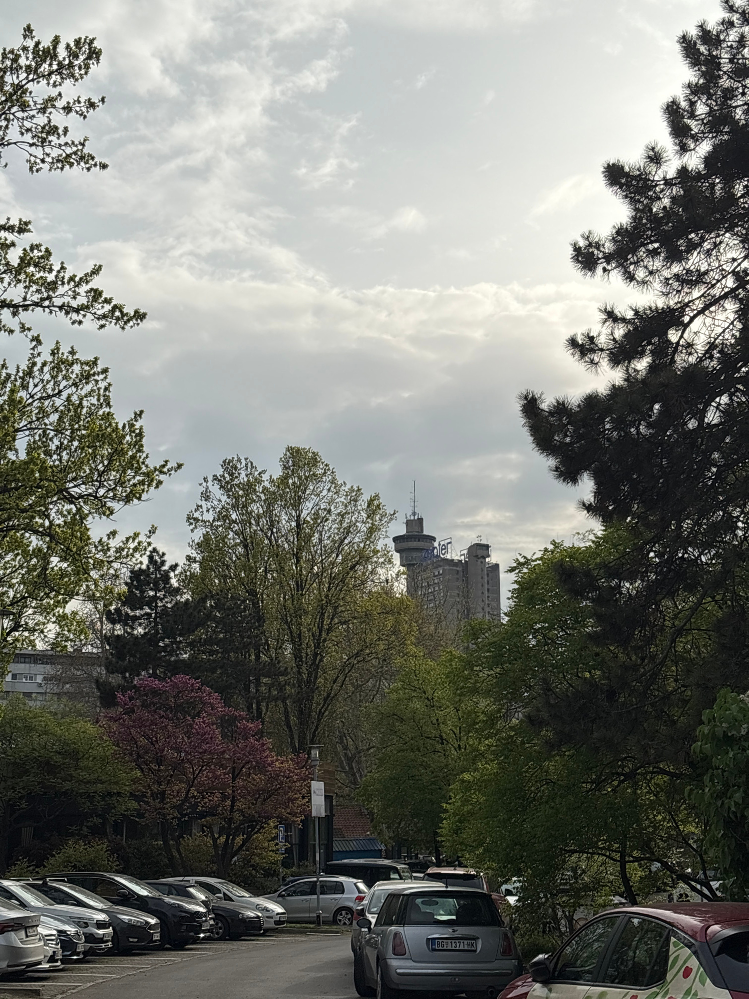 The image shows a view of Belgrade, Serbia. In the distance, a telecommunications tower and several apartment buildings are visible. Trees line the street, some with pink blossoms. Cars are parked alo…read more