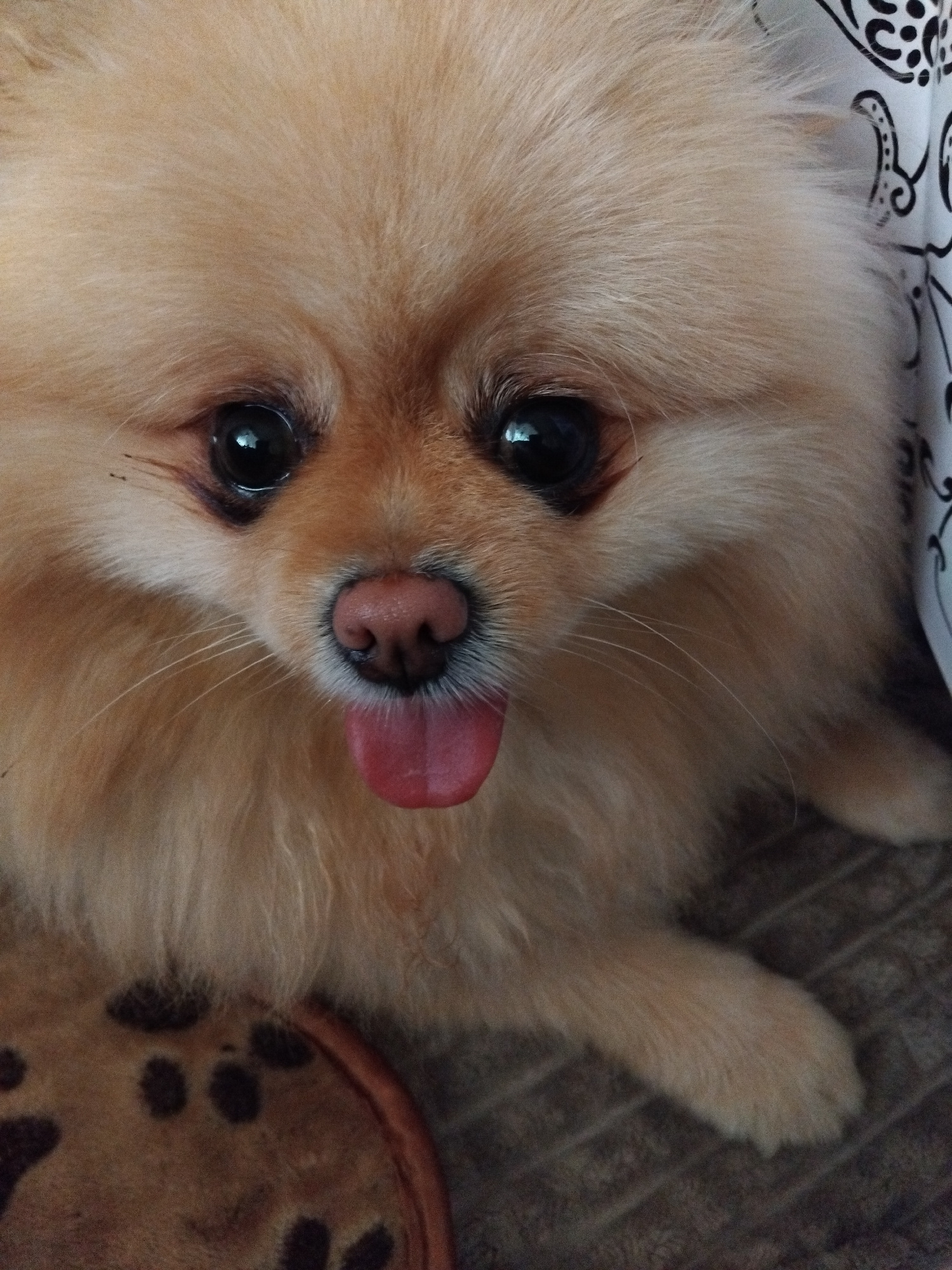 An eye-level close-up captures a light-furred Pomeranian dog lying down, looking directly at the viewer. The dog's fluffy, pale golden-brown fur dominates the frame, creating a soft texture. Its large…read more