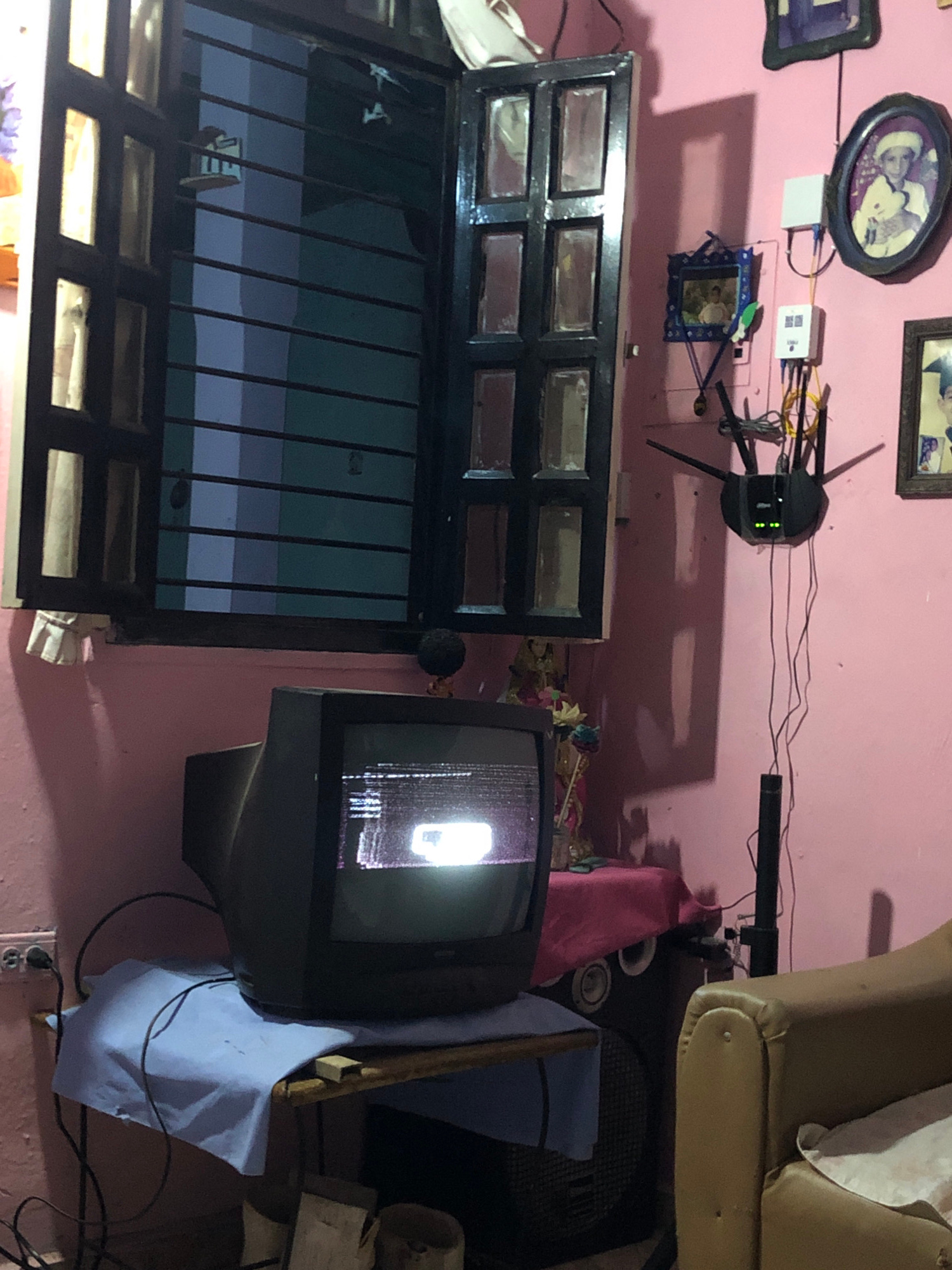 The image shows an indoor scene with a pink wall as the backdrop. Several framed pictures are hanging on the wall, along with a router and some network equipment. Below the decorations, there's a blac…read more