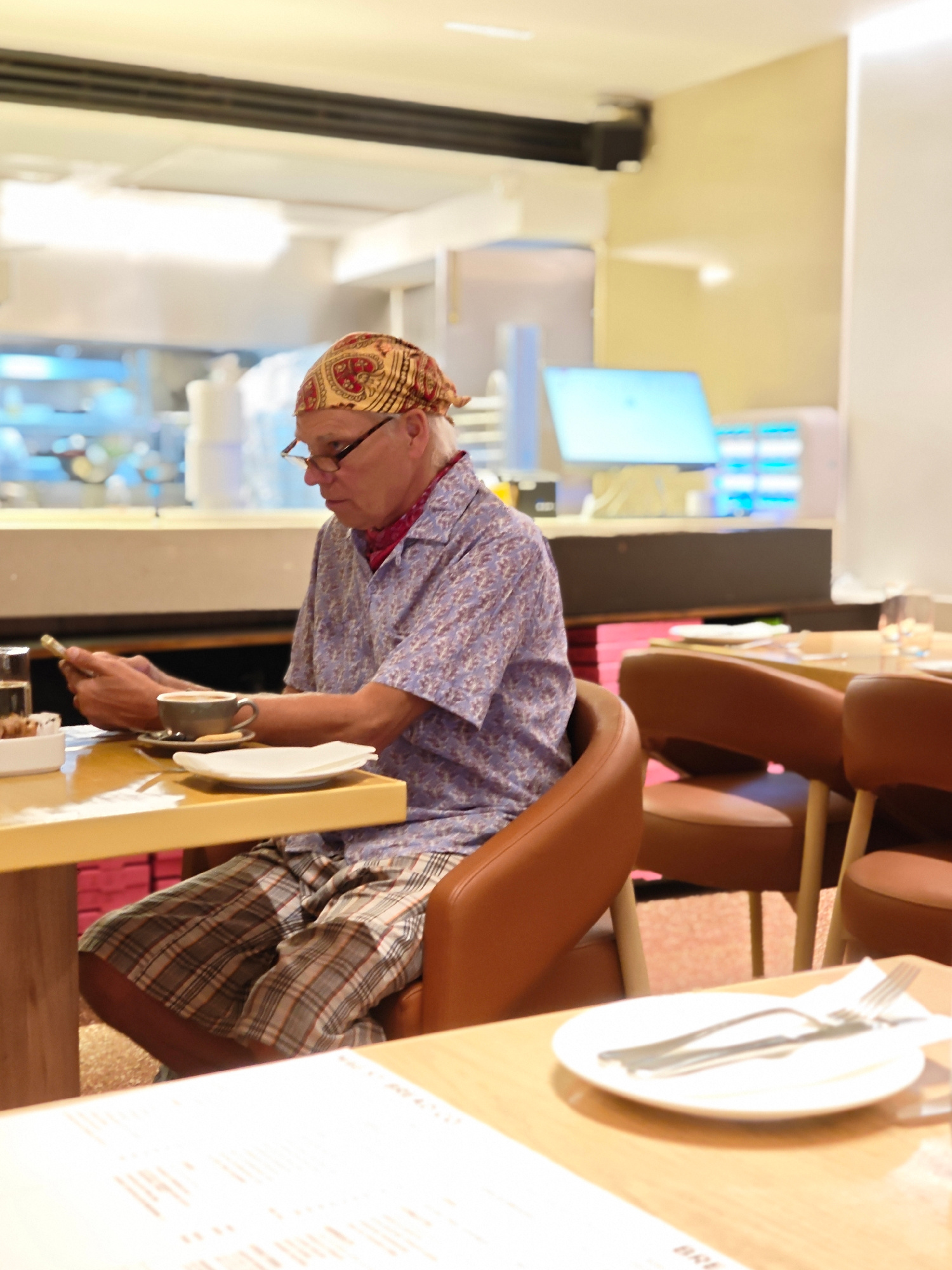 An elderly man wearing glasses, a paisley-patterned bandanna, a purple patterned short-sleeved shirt, and plaid shorts is seated at a yellow table in a restaurant. He is looking at a cell phone in his…read more
