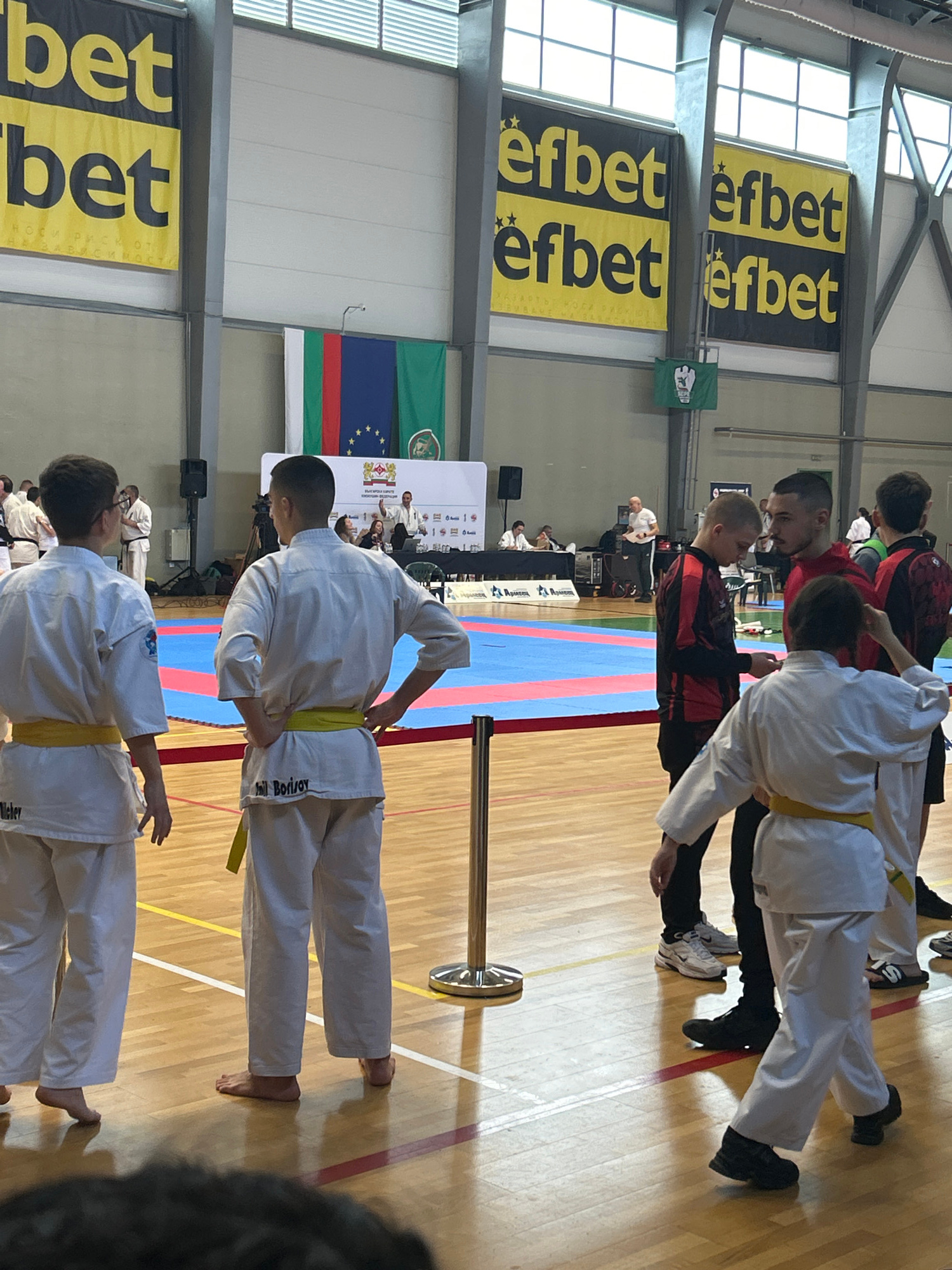 The image depicts an indoor martial arts competition, likely karate or similar discipline. Several participants are seen, some in white uniforms with yellow belts and others in red and black attire. T…read more