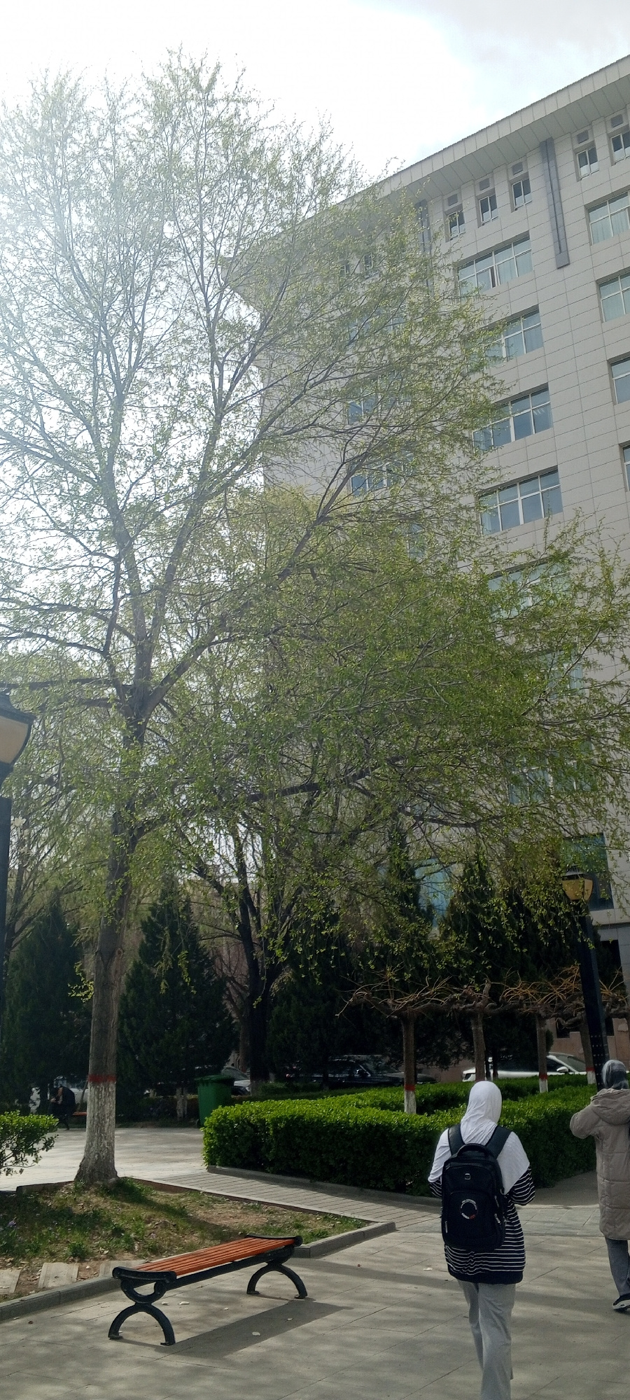 The image depicts a public space, likely a park or courtyard, in Baota District, China. In the background is a multi-story building with a grid of windows. Dominating the foreground is a large tree wi…read more