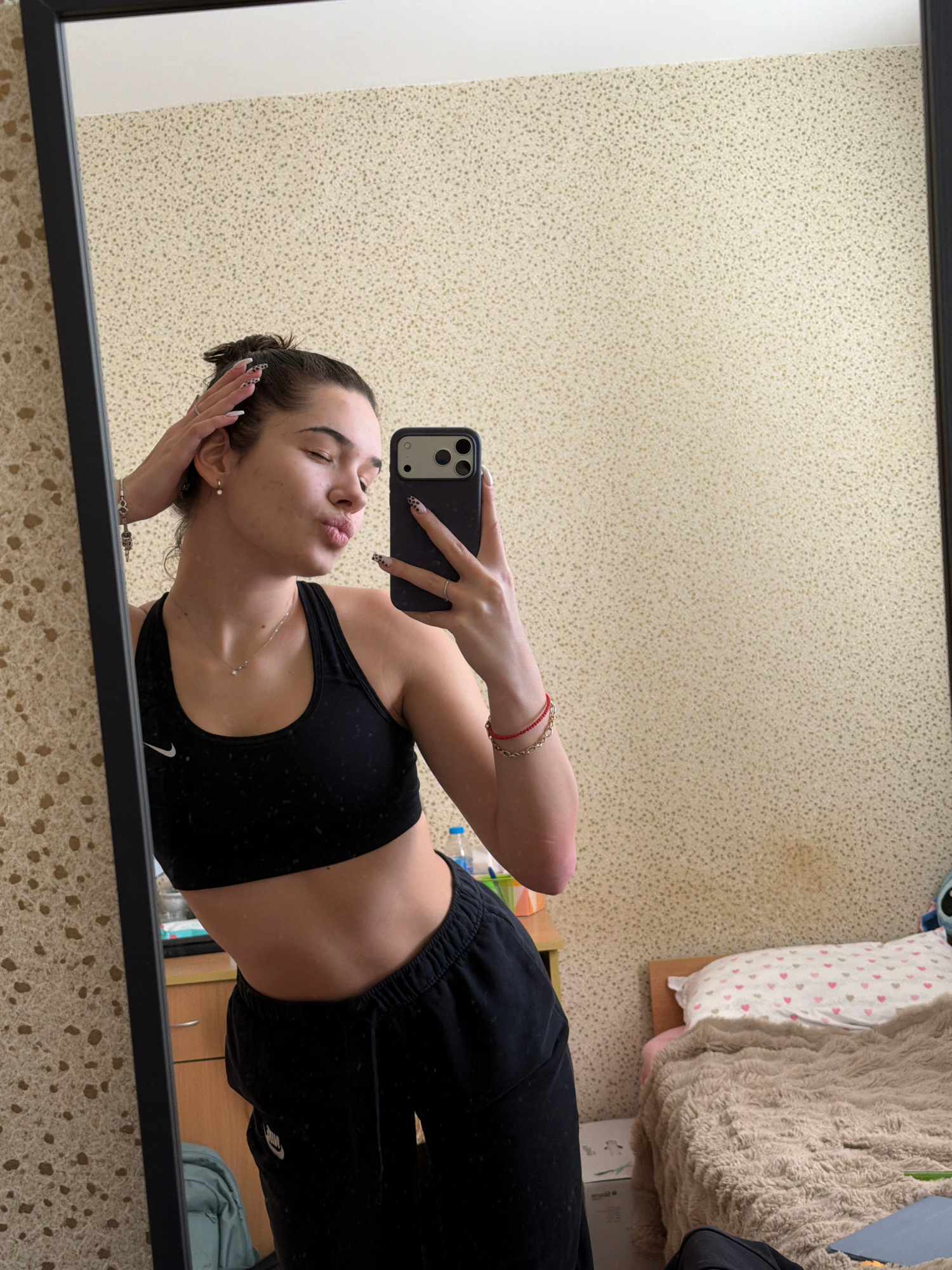 A young adult female is taking a selfie in a mirror. She is wearing a black sports bra and black sweatpants. She is holding a black iPhone in her right hand. Her left hand is near her head. She is sta…read more
