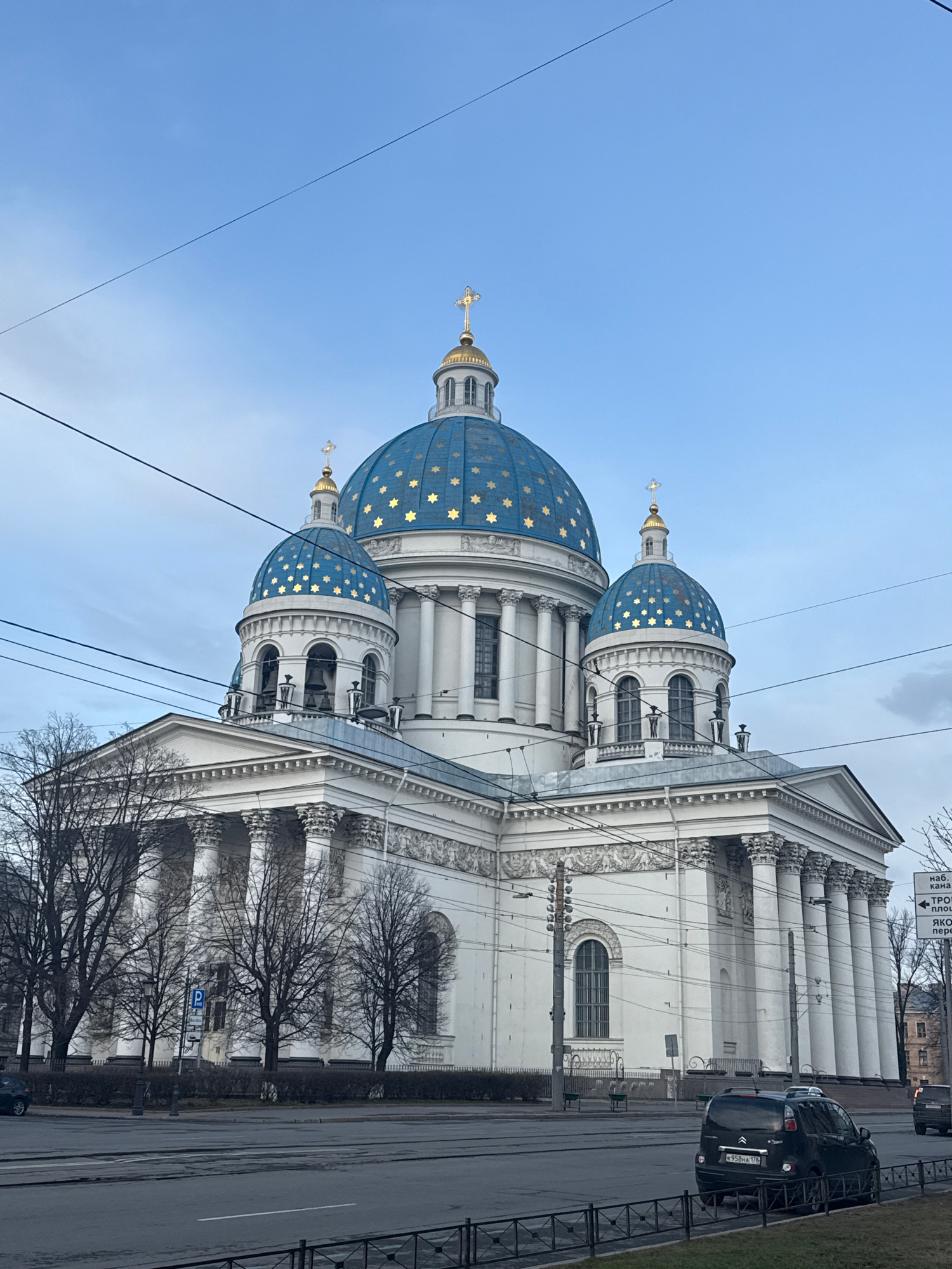 The image shows the Trinity Cathedral in Saint Petersburg, Russia, a large white and blue baroque-style cathedral with five domes. The domes are blue with gold stars, and the cathedral has many white…read more