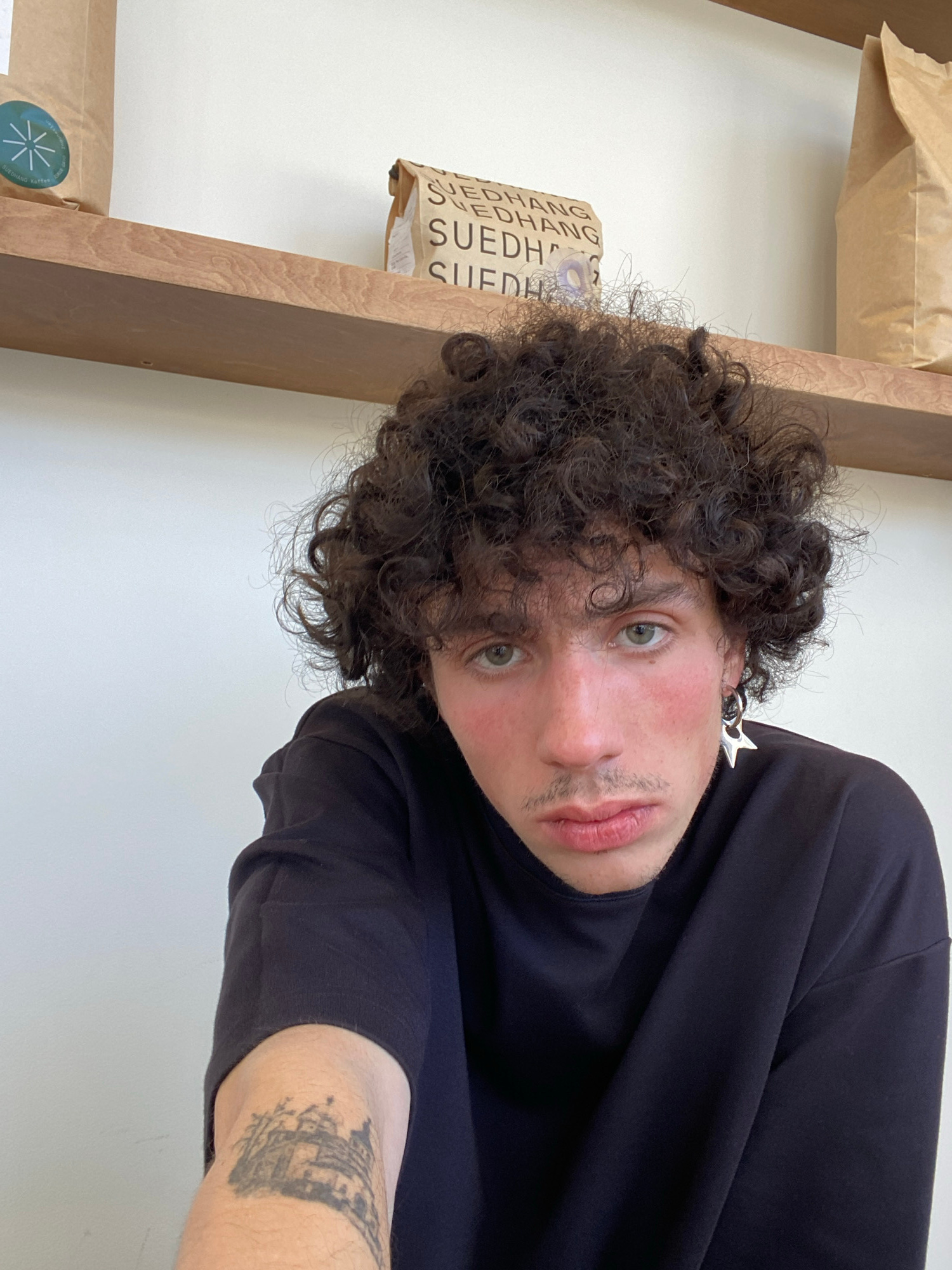 A head-and-shoulders portrait depicts a young individual with dark, curly hair and green eyes, looking directly at the camera. The subject has light stubble on the upper lip and chin, and prominent re…read more