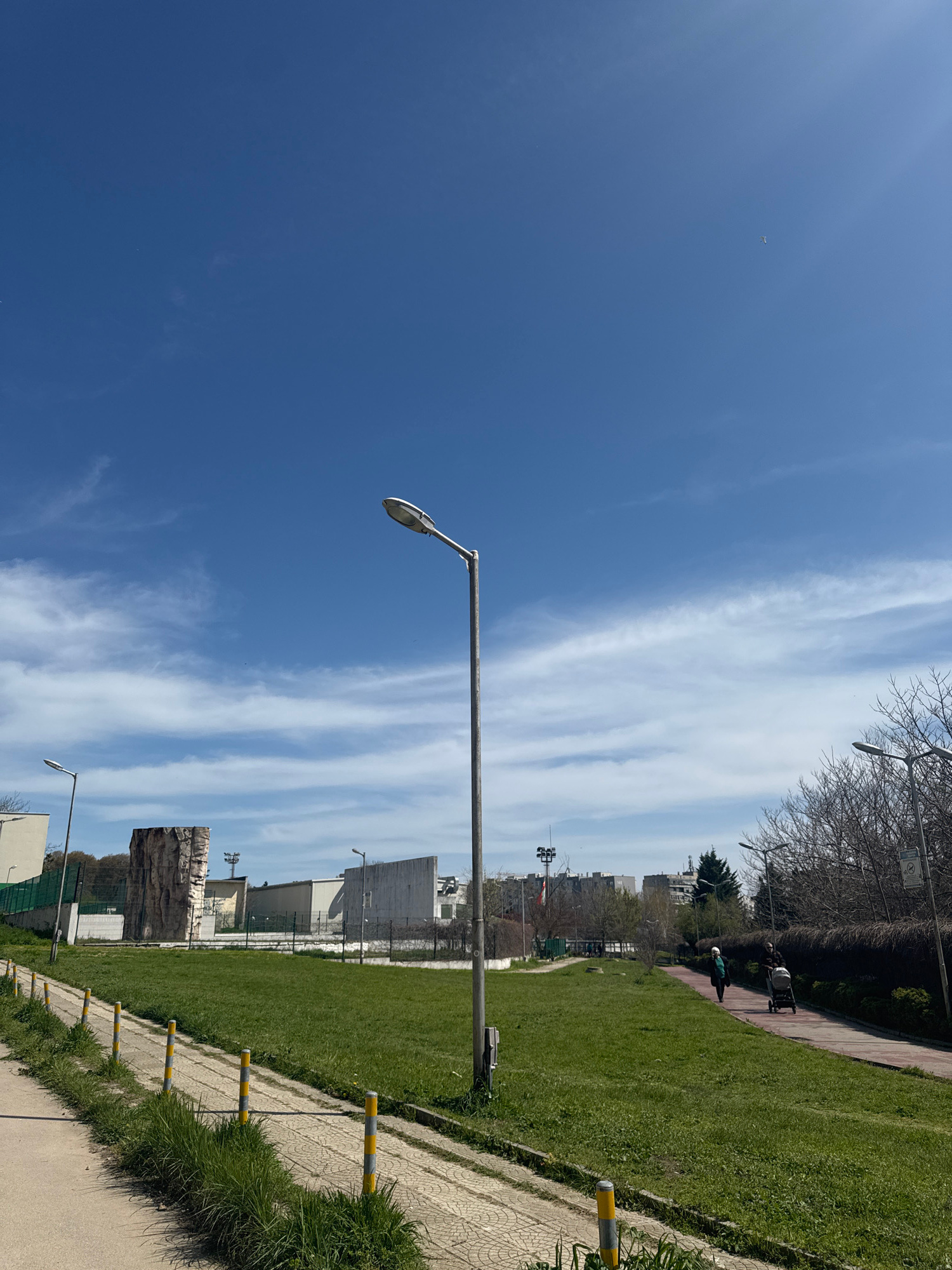 The image depicts a public green space or park under a bright, clear blue sky with thin, wispy white clouds stretching horizontally across. The sun is high, suggesting it is daytime, likely late morni…read more