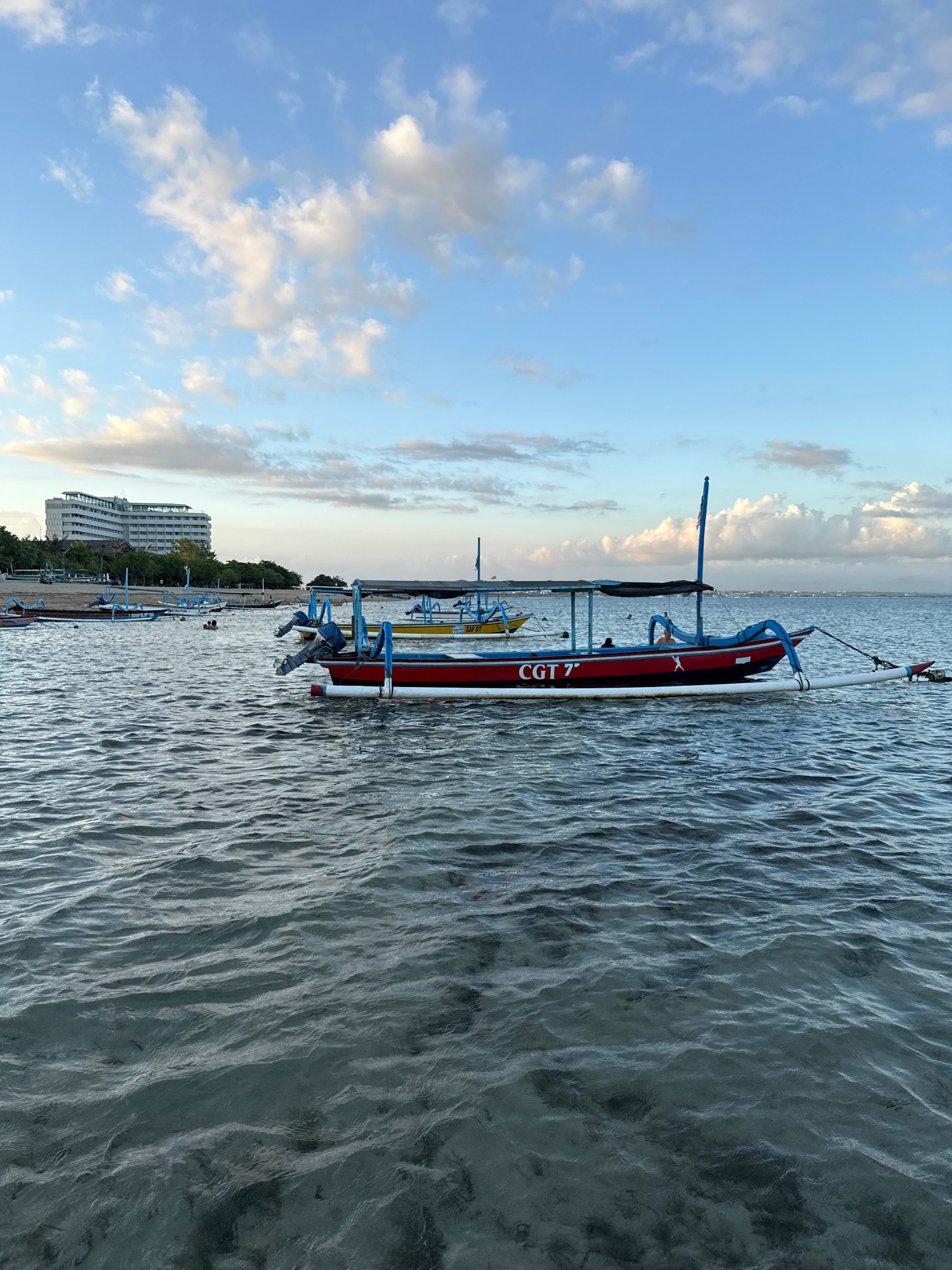 The image depicts a traditional outrigger boat in the water. The boat is predominantly red and blue, with "CGT 7" painted on its side. Other boats, including one that is yellow, are visible nearby. In…read more