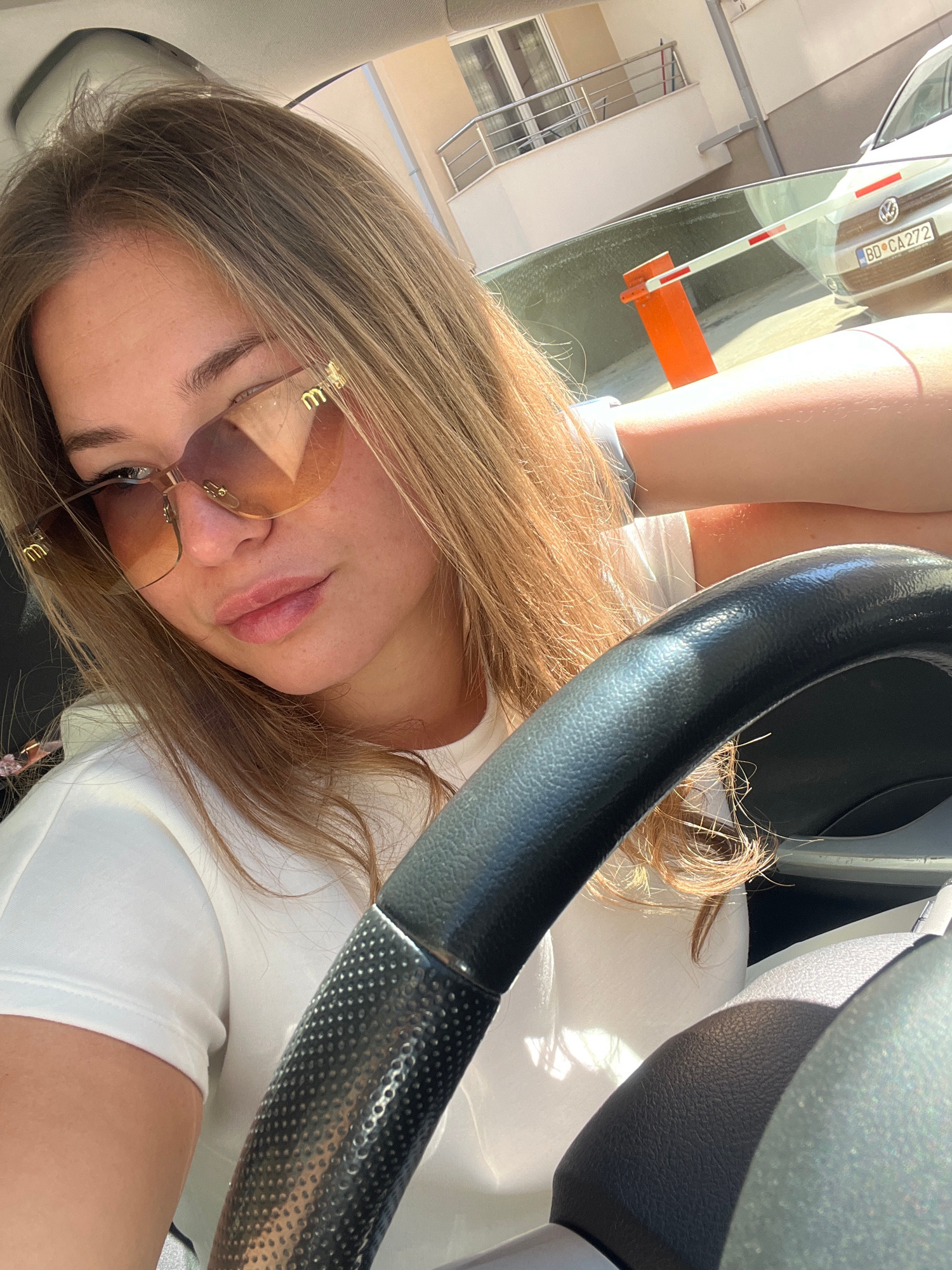 The image features a young woman resting inside a car, positioned so her head is visible in the foreground, facing towards the left side of the frame. Her long, light brown hair cascades around her fa…read more