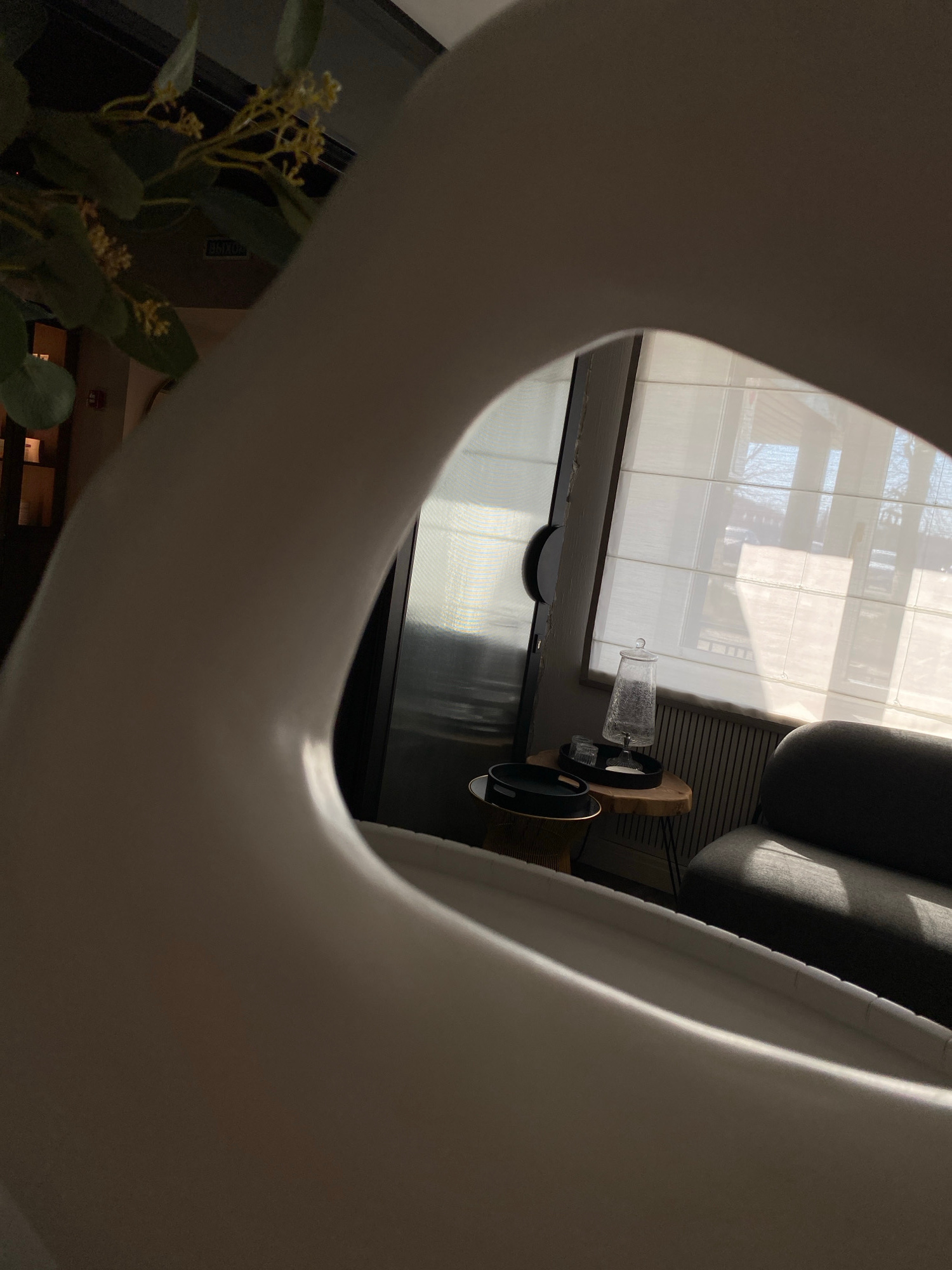 The image, taken with a portrait orientation and rotated 90 degrees clockwise, captures an interior scene through the organic curve of a large, off-white object, possibly a modern furniture piece or a…read more