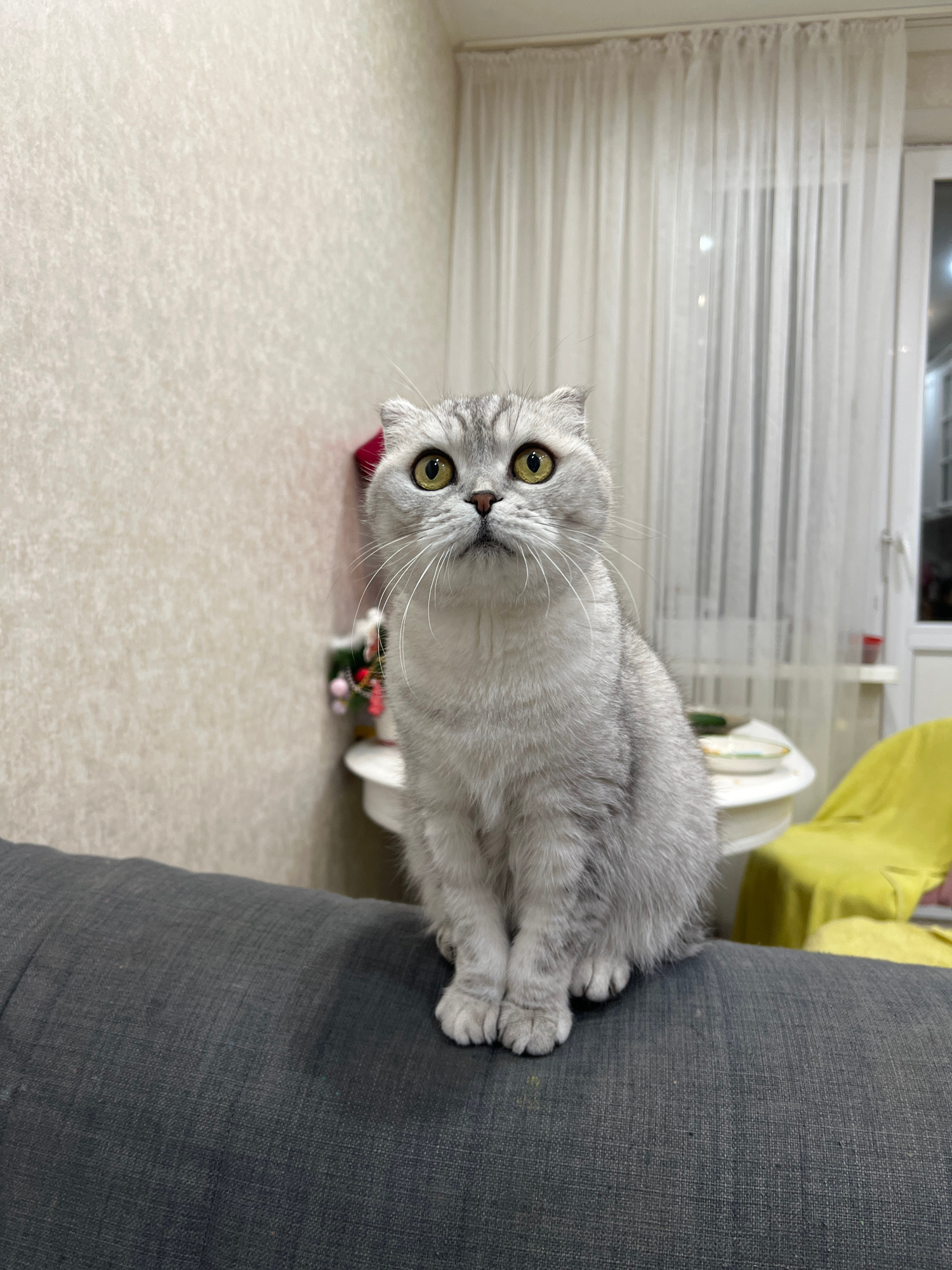 A photograph, rotated ninety degrees clockwise, captures a silver tabby cat with vivid green eyes and prominent white whiskers. The cat, appearing to be a Scottish Fold with its folded ears, is positiβ¦read more