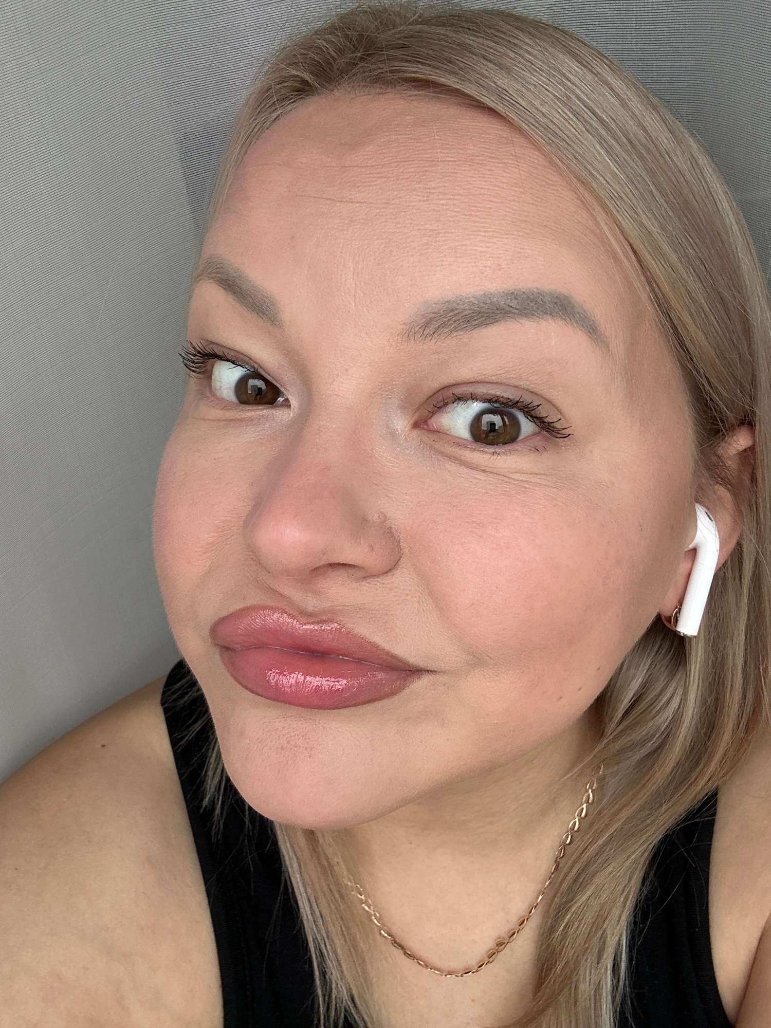 A close-up, angled portrait photograph of a woman with light blonde hair, fair skin, and brown eyes. She is wearing a white earbud in her left ear and a delicate gold chain necklace. She has full lipsβ¦read more