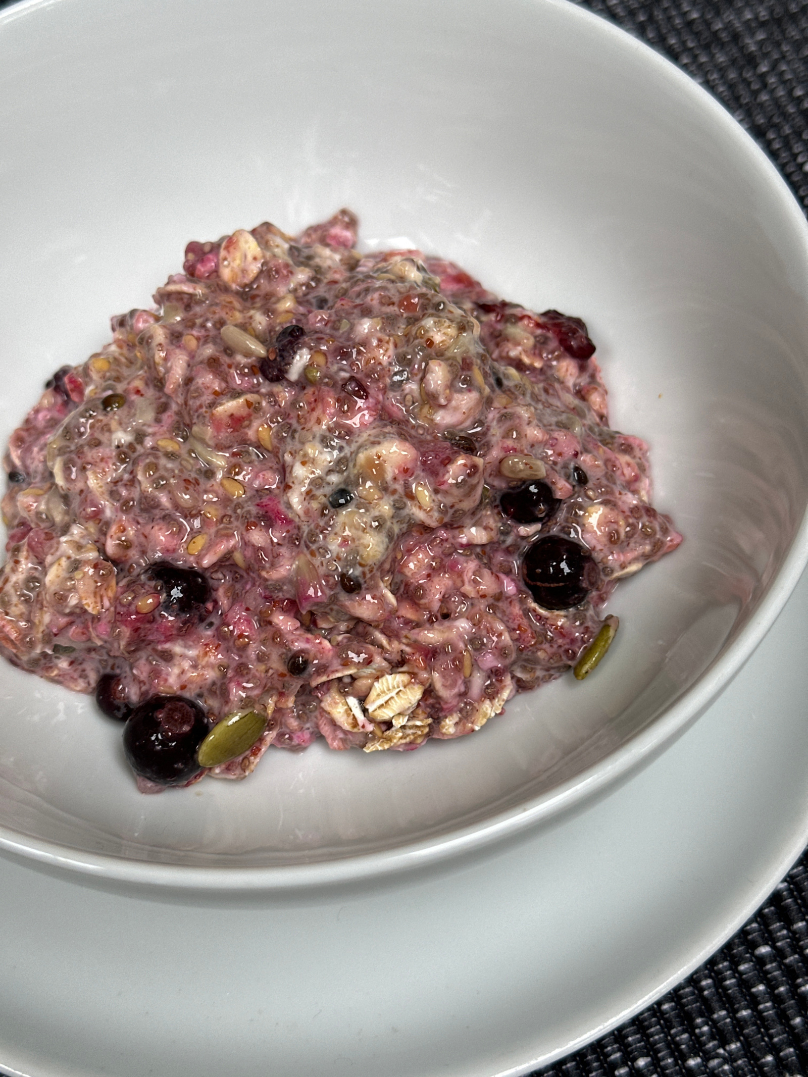 A close-up, top-down image depicts a serving of overnight oats or a similar mixed berry and grain breakfast item contained within a white ceramic bowl. The food product, appearing thick and viscous, fâŚread more