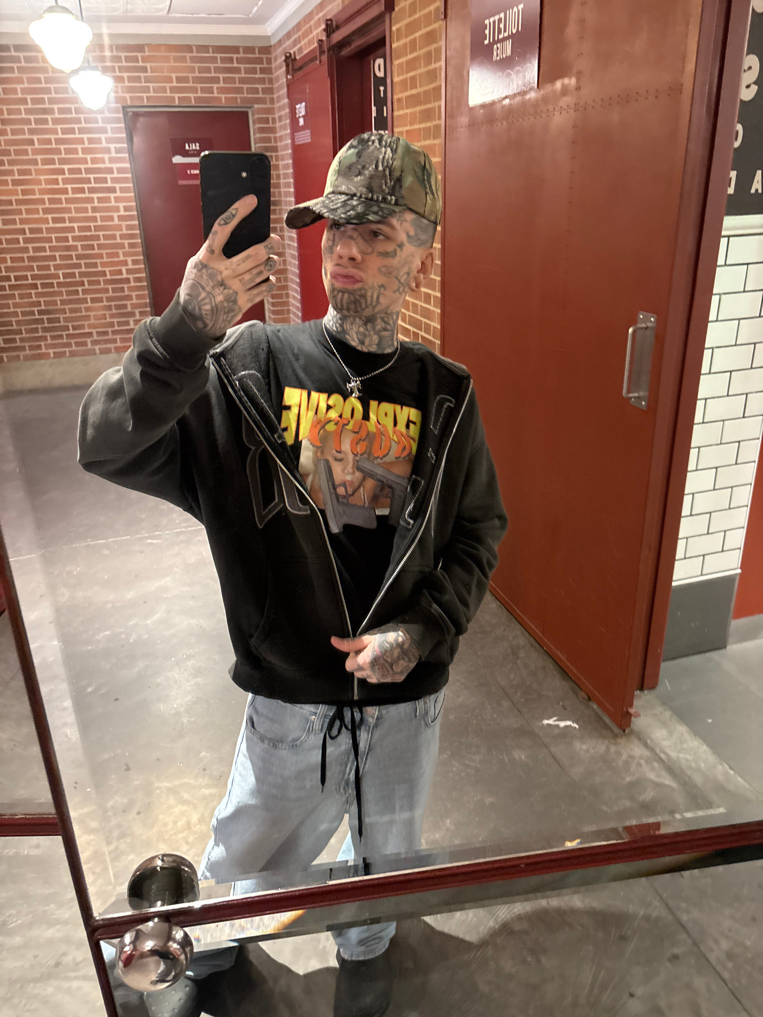 A person is captured in a mirror selfie, standing in an indoor setting that appears to be a public restroom in Buenos Aires, Argentina. The individual, who has extensive tattoos covering their face, n…read more