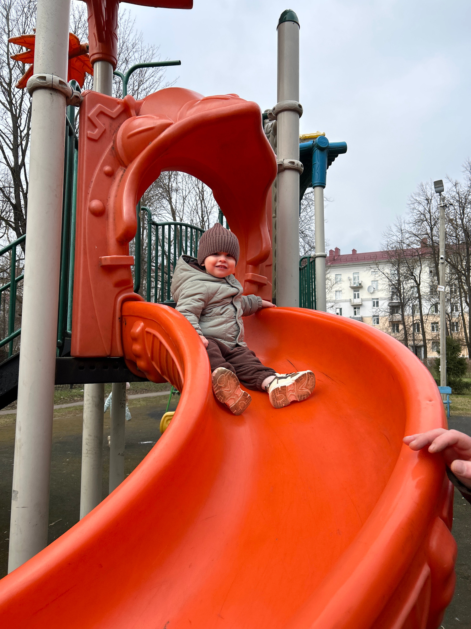 A child is lying on a playground slide. The child is wearing a brown hat, a light grey jacket, and brown pants. The child is smiling. The slide is orange and part of a playground structure with white…read more