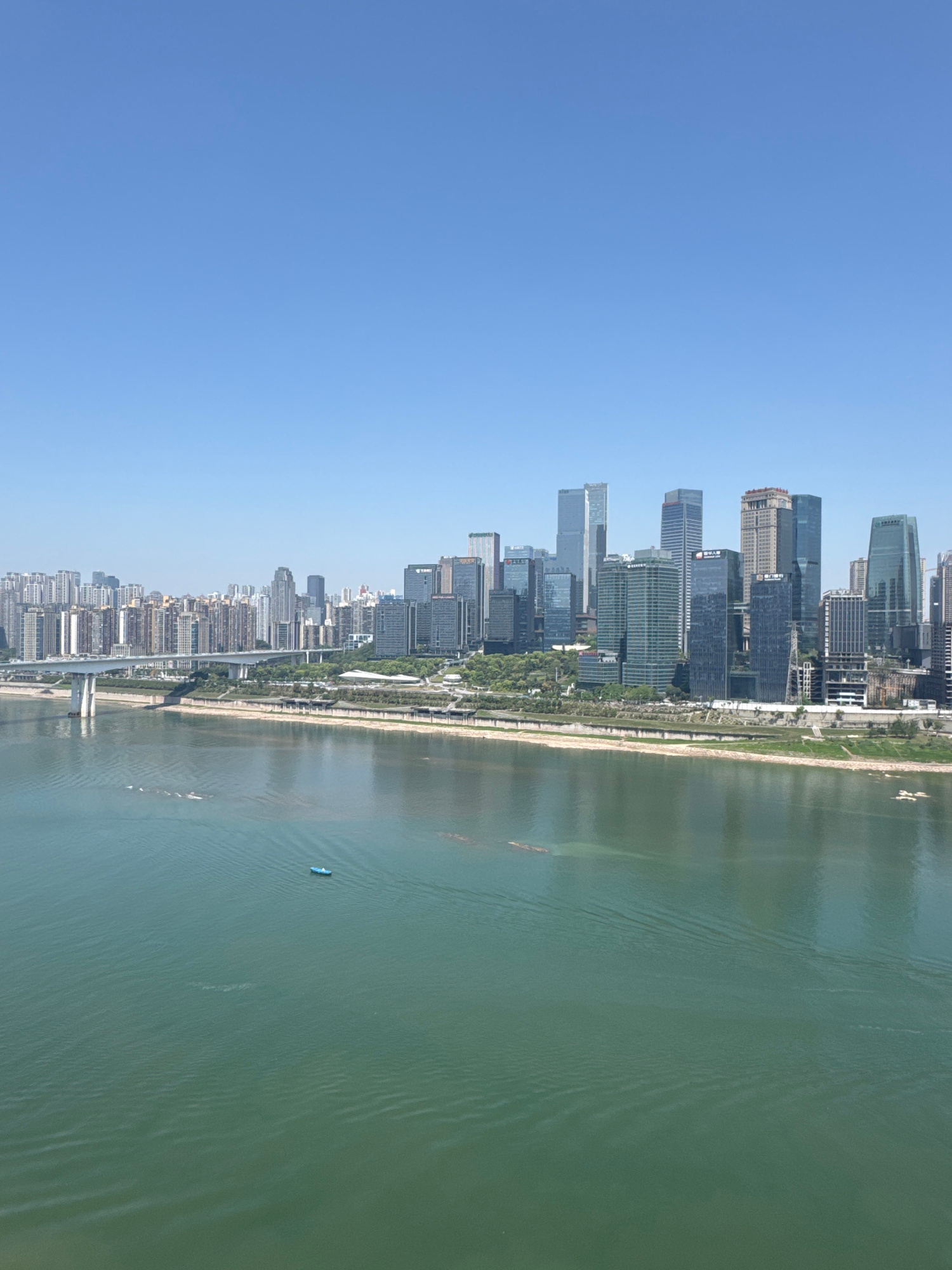 The image shows a cityscape in Yuzhong District, Chongqing, China, taken from an elevated perspective. On the left is a clear, blue sky. The right side of the image features a body of water with rippl…read more