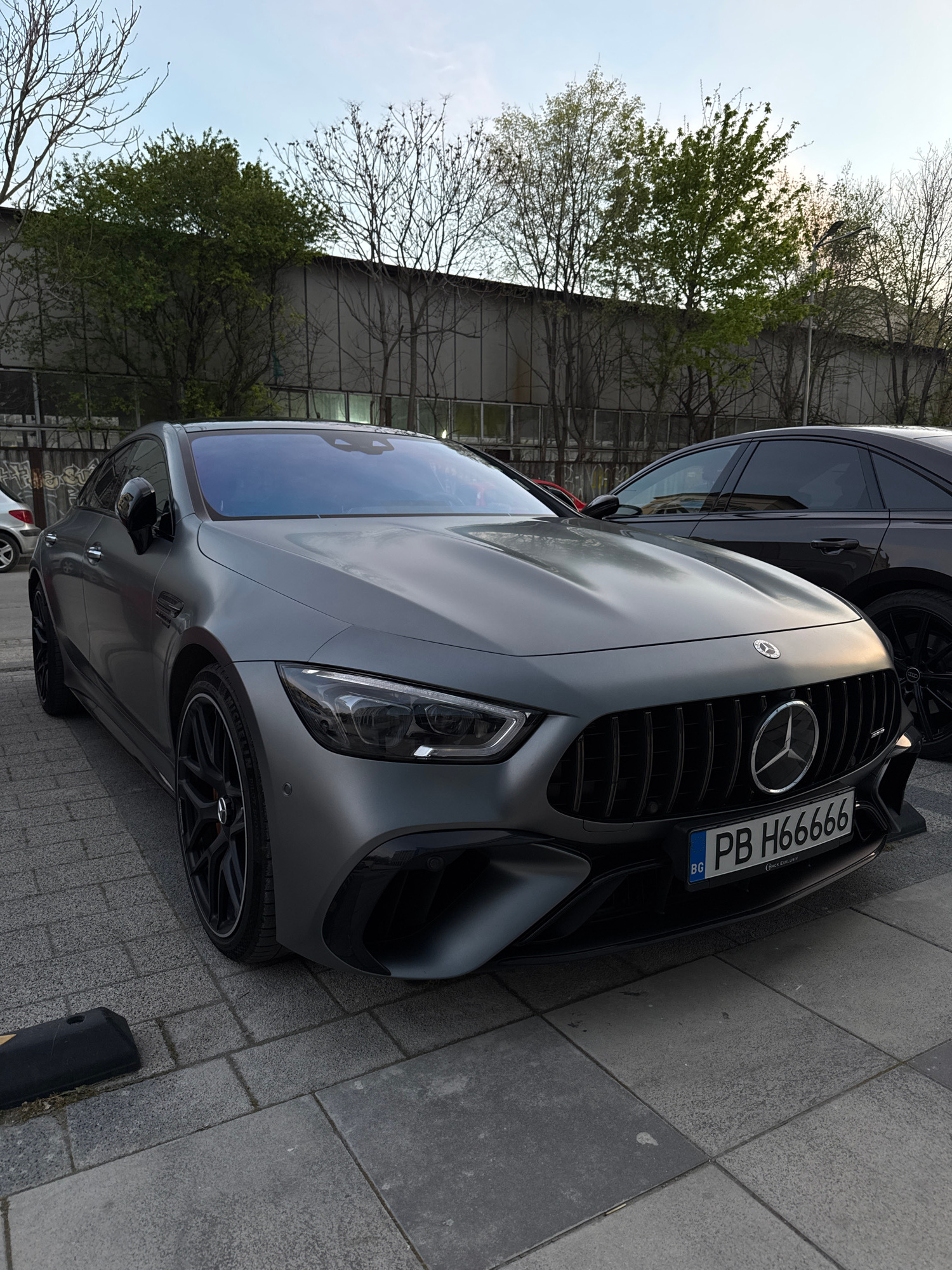 A gray Mercedes-Benz car is parked on a paved surface, likely a sidewalk or street, in an urban environment. The car's front is visible, including the grille, headlights, and license plate, which readβ¦read more