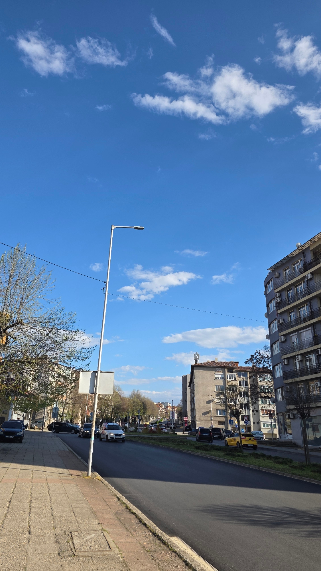 The image depicts a street scene in Blagoevgrad, Bulgaria, on a sunny day. The sky is blue with scattered white clouds. Buildings line the street, including a taller apartment building with air condit…read more