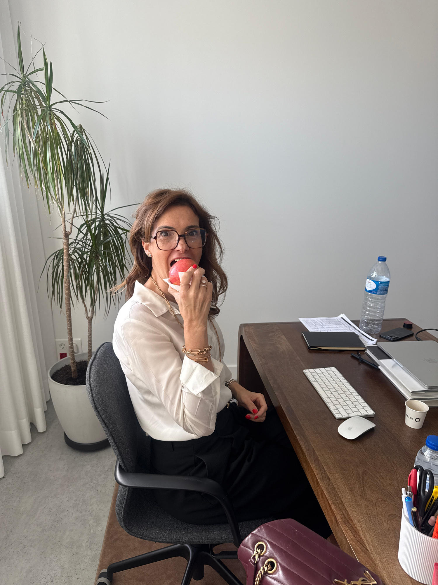 A woman with brown hair and glasses is sitting in an office chair, positioned at a wooden desk. She is wearing a white shirt and has multiple bracelets on her left wrist. She is eating an apple. On th…read more