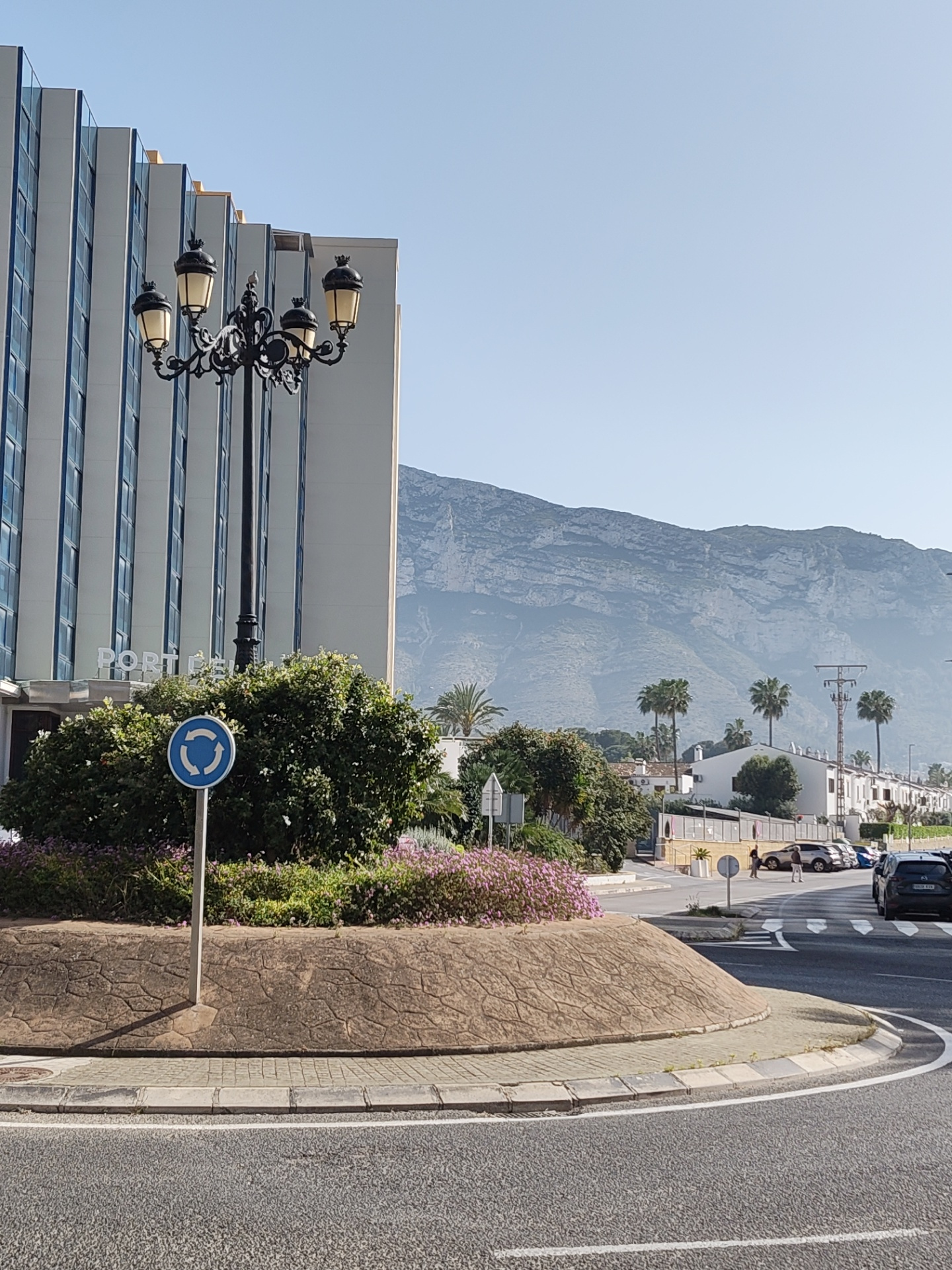 The image shows a roundabout in Dénia, Spain, with a building partially visible on the left side with the sign "PORT D....". On the roundabout is a circular flower bed with a traffic sign indicating a…read more