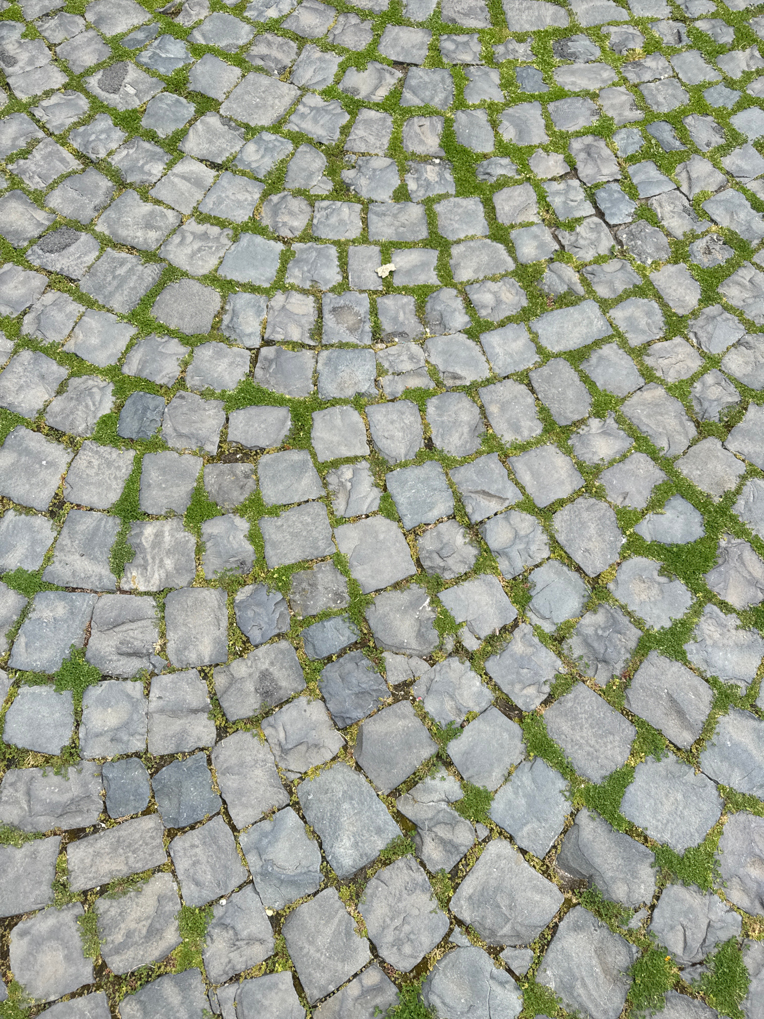 The image shows a section of a cobblestone pavement. The cobblestones are generally square-shaped and gray in color. Green vegetation grows between the stones. A single, small yellow leaf rests on one…read more