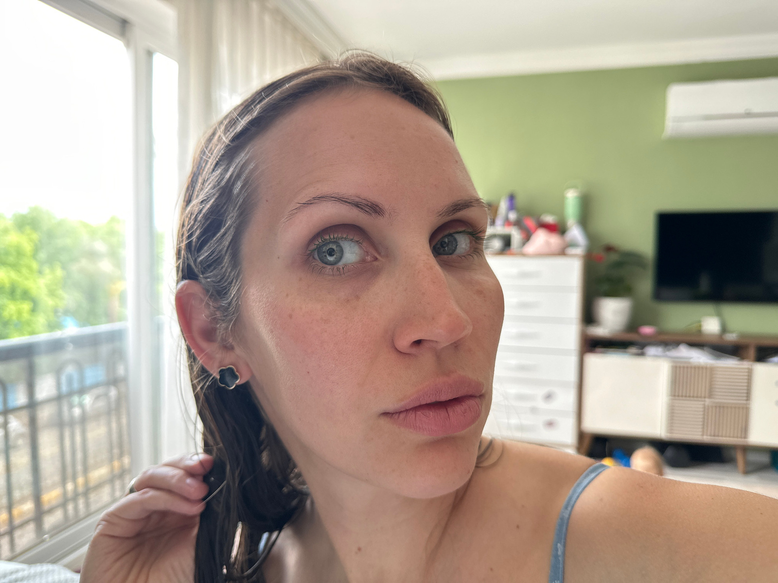 A woman with light skin and blue eyes is centered in the frame, looking slightly to her right. Her hair is wet and dark, framing her face. She is wearing a blue tank top. The background is an interior…read more
