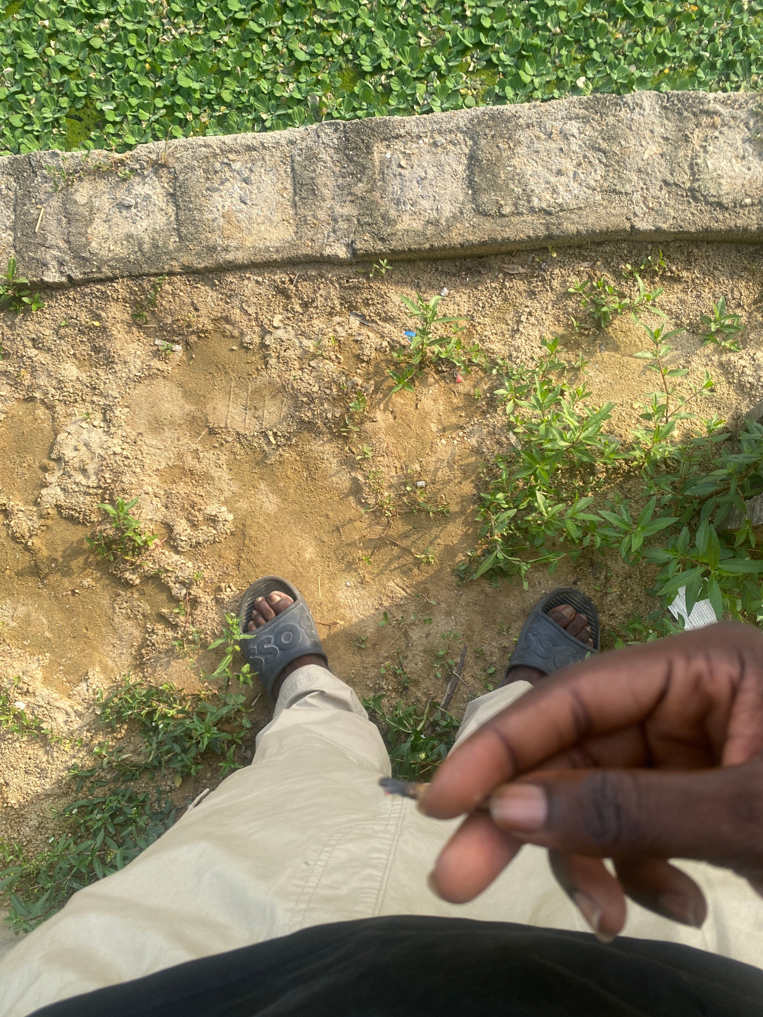 A person stands in a grassy, sandy area next to a concrete border. The person is wearing beige pants, a black shirt, and gray sandals. They are holding a small object, possibly a twig or cigarette, between their fingers. The location is unspecified, but the request mentions Lagos, Nigeria. | Open Wire