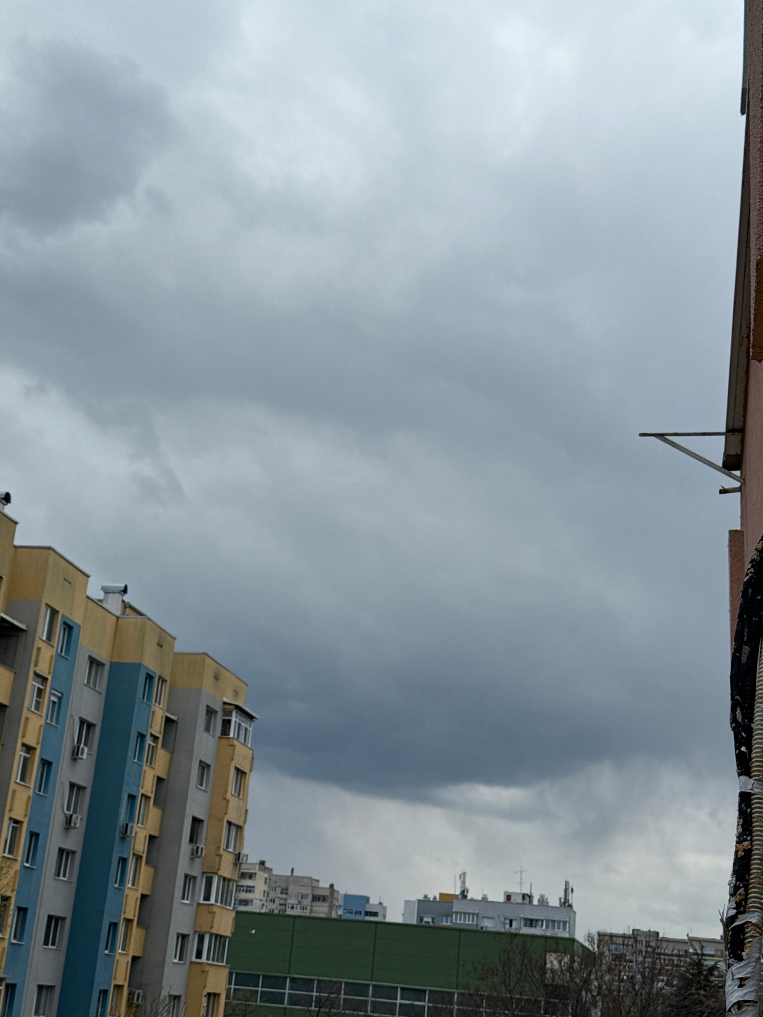 The image is a low-angle shot of a cloudy sky above several buildings. The buildings include a high-rise with blue and yellow detailing, another with a green section, and other structures in the dista…read more