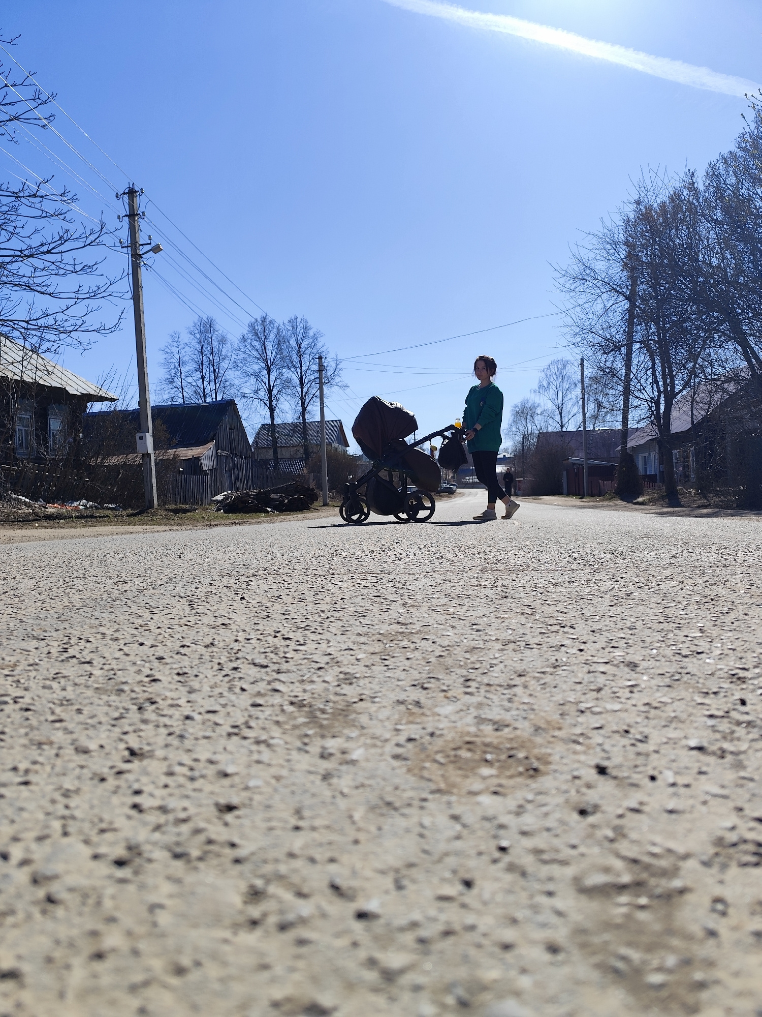 A low-angle outdoor photograph captures a woman pushing a baby stroller down a street in the village of Фоки, Russia. The woman is seen in profile on the right side of the frame, wearing a green long-…read more