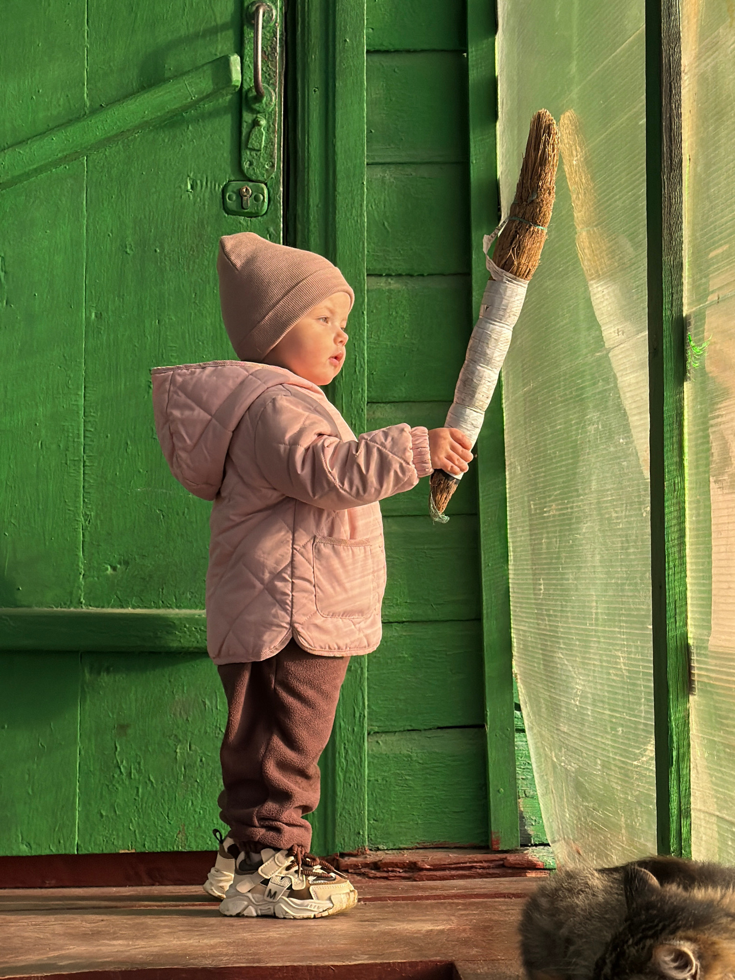 A toddler, wearing a pink quilted jacket, brown pants, a mauve beanie, and white sneakers with brown laces, holds a broomstick wrapped with white tape in front of a green wooden building. The setting…read more