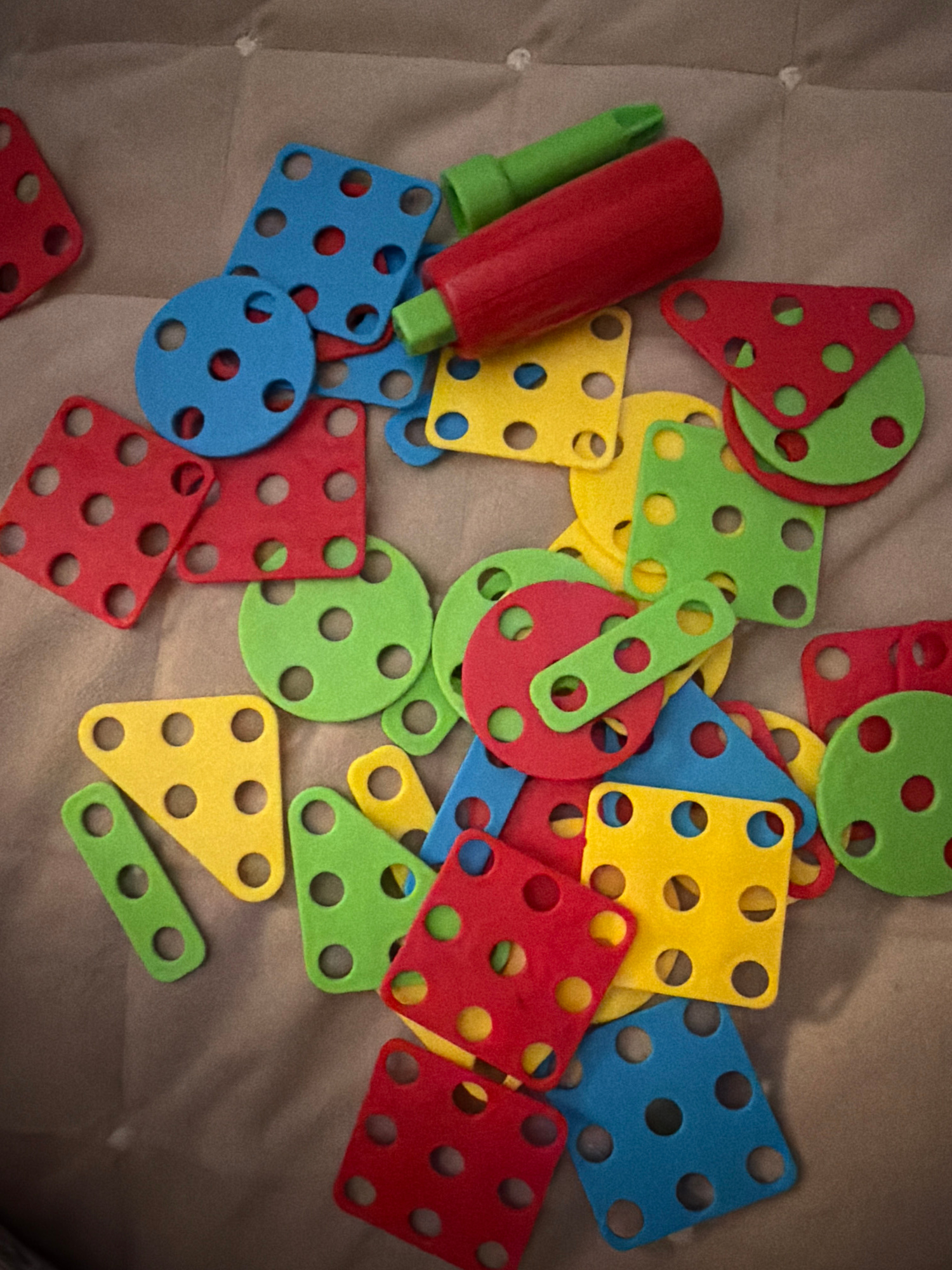 The image shows a collection of children's construction toys scattered on a light brown fabric surface. The toys are made of colorful foam, primarily in red, blue, yellow, and green. The shapes includ…read more
