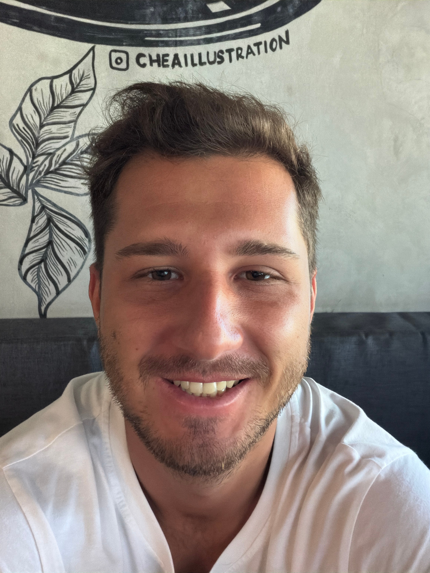 A light-skinned male with brown hair and stubble is smiling at the camera. He is wearing a white t-shirt. To his left is a light-colored wall with a painted illustration of leaves and the Instagram ha…read more