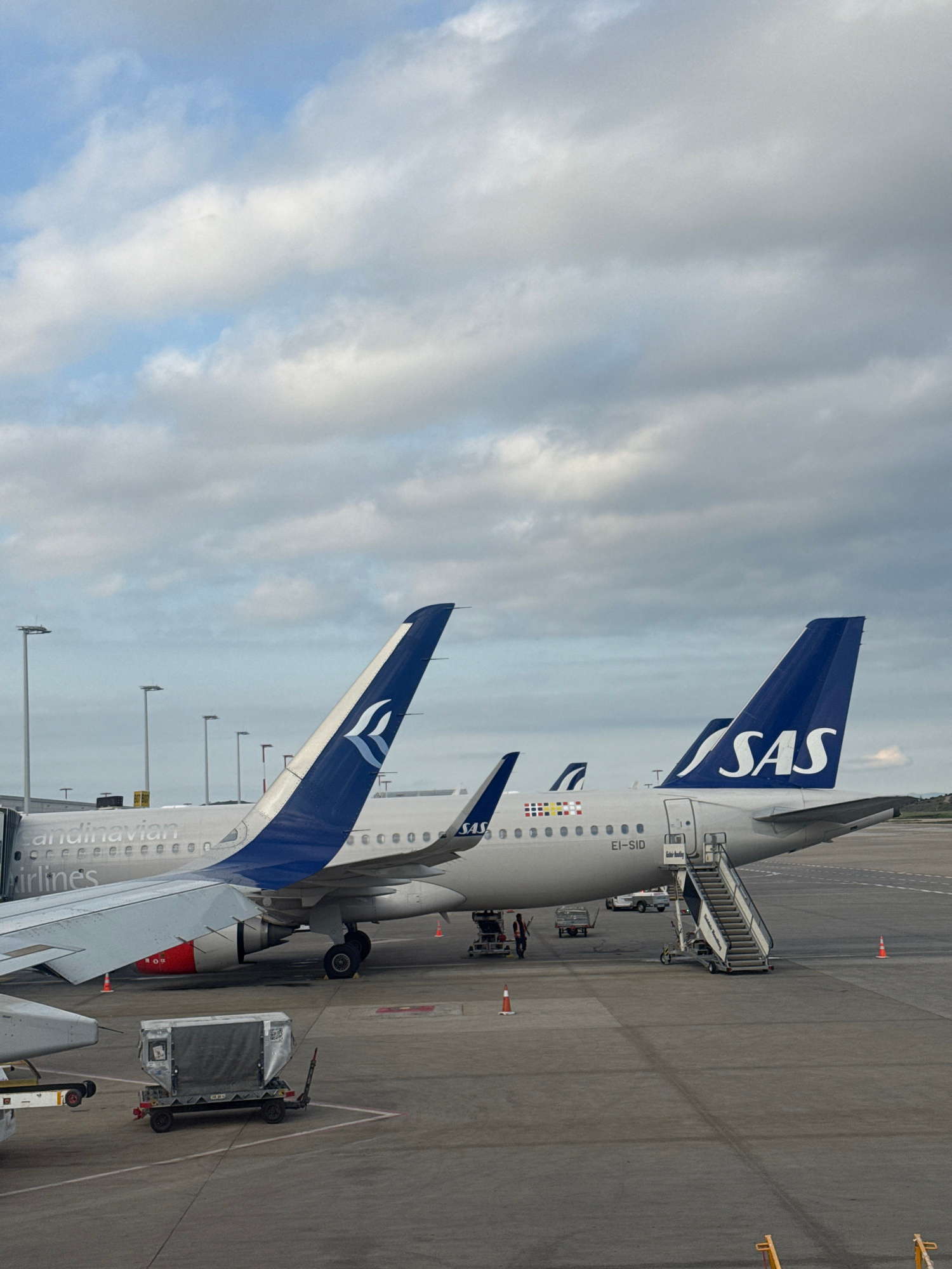 The image shows a view of parked SAS (Scandinavian Airlines) airplanes at an airport in Spata-Loutsa Municipal Unit, Greece. The planes are on a tarmac with airport ground crew vehicles nearby. The sk…read more