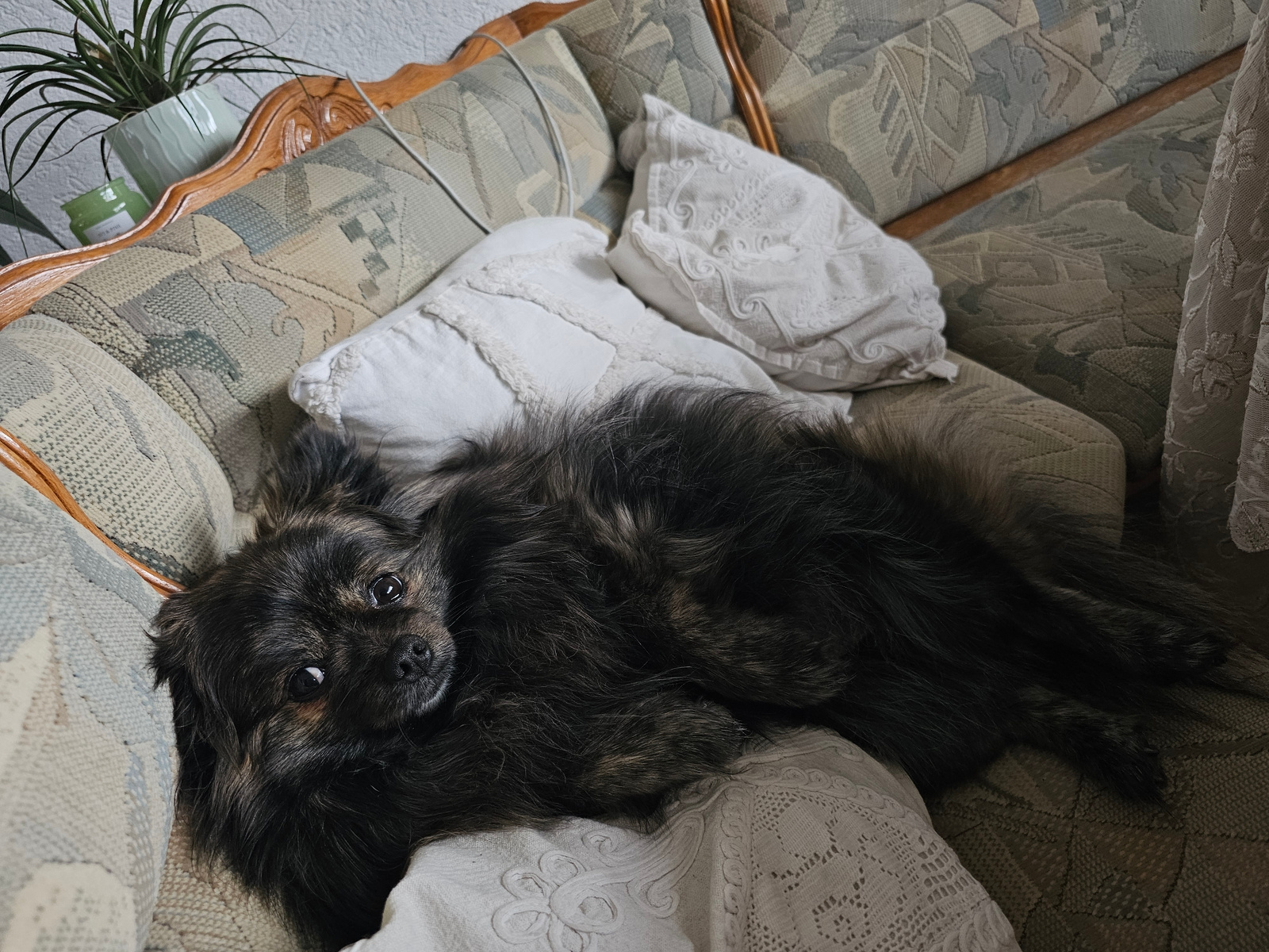 A medium-sized, long-haired, dark brown and black dog is resting on a patterned couch with white pillows. A plant is visible in the upper left corner, sitting on the couch's armrest. A curtain is visi…read more