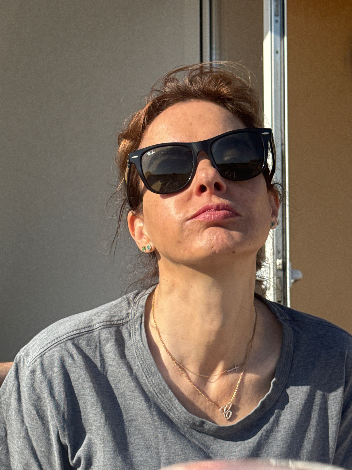 A woman with sunglasses, wearing a gray t-shirt and a gold necklace, is photographed in an outdoor setting. The location and city details (Vila Nova de Gaia, Portugal) are not identifiable from the vi…read more