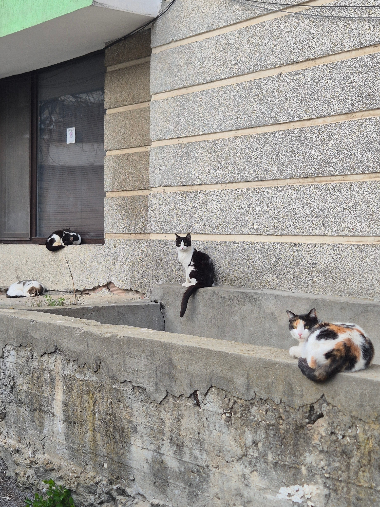 The image, taken in Pavlikeni, Bulgaria, depicts a set of concrete stairs leading to a building entrance. The stairs have a ribbed texture. Four cats are present. A calico cat is at the top of the sta…read more