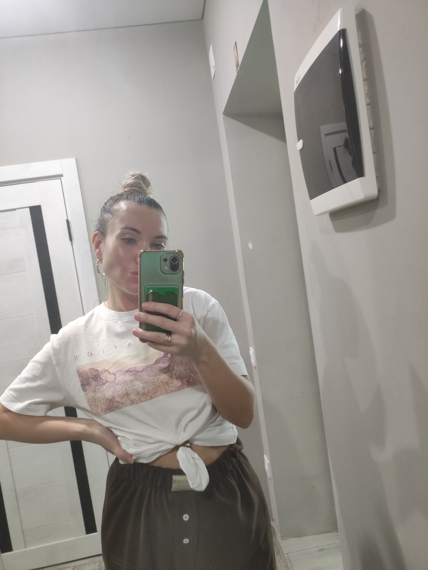 A woman with blonde hair in a high bun is taking a selfie in a bathroom. She is wearing a white t-shirt with a nature print and brown pajama bottoms tied at the waist. She is holding a green smartphon…read more