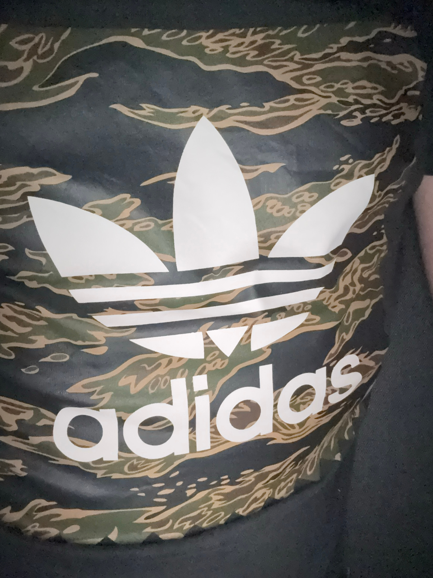 The image shows a close-up of an Adidas logo printed on a fabric with a camouflage pattern. The Adidas logo is white, while the camouflage pattern is a mix of green, brown, and black. The text "adidas…read more