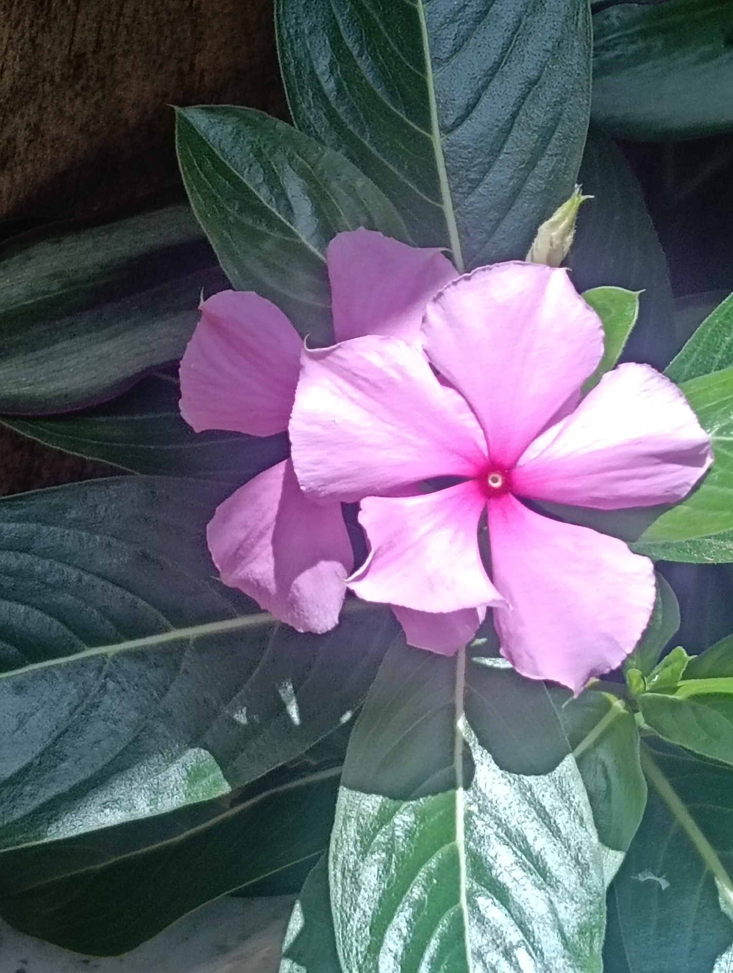 The image features two pink Madagascar Periwinkle flowers surrounded by glossy green leaves. The flowers have five petals each and a dark pink center. A small bud is visible near the top right of the…read more
