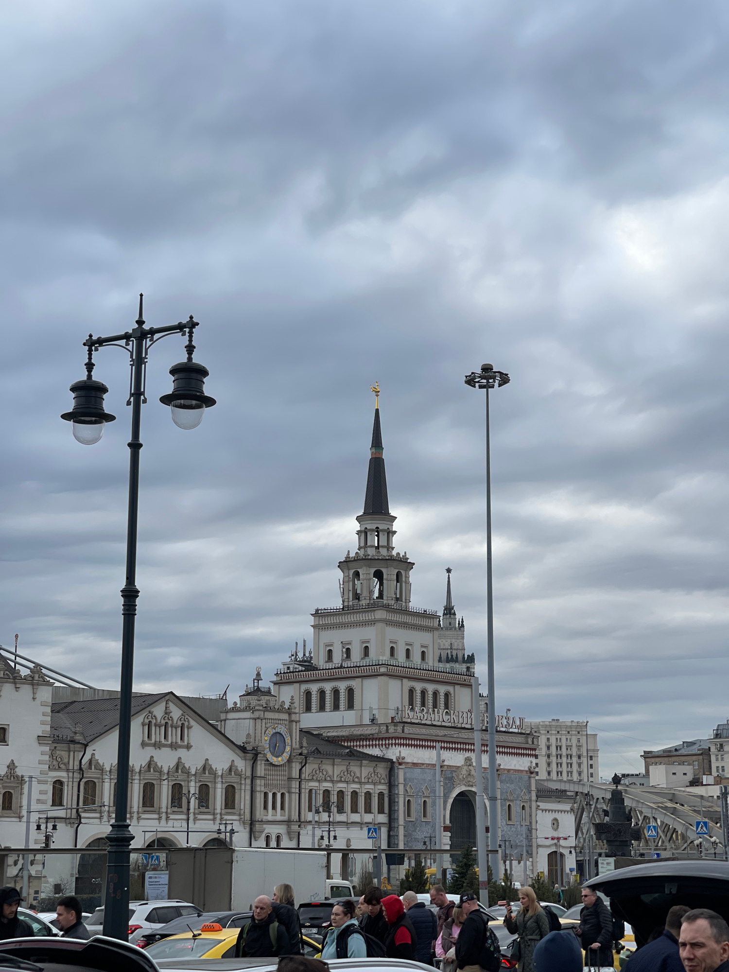 The image depicts the Kazansky railway station in Moscow, Russia, under a cloudy sky. The station's ornate white façade, clock tower, and spire are visible. Street lamps are in the foreground. People…read more