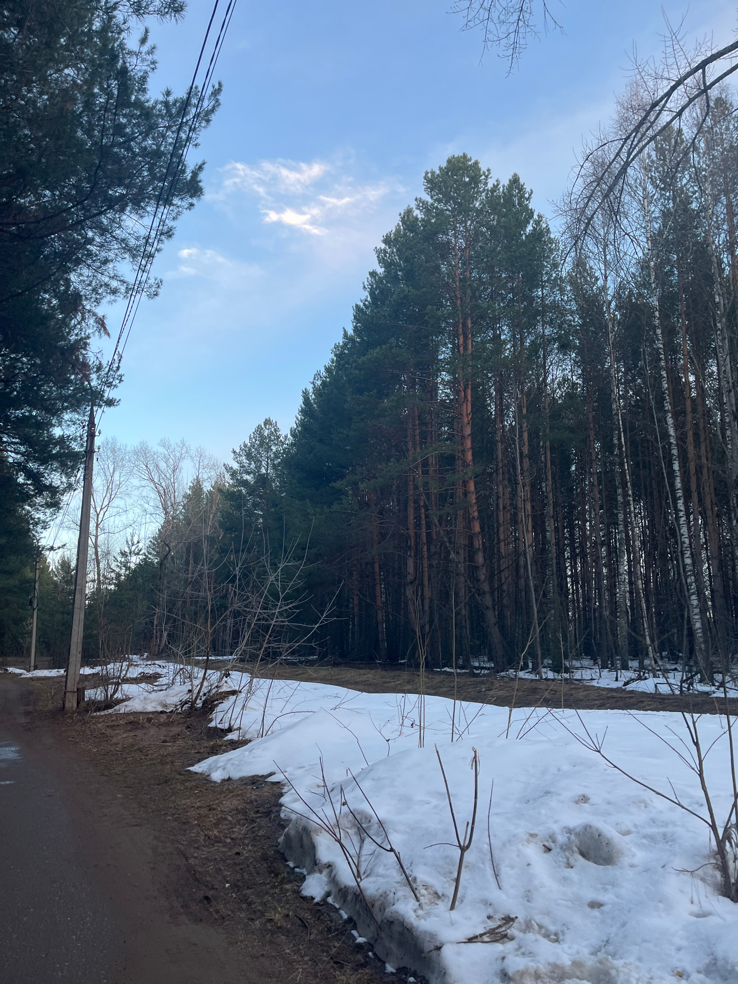 The image depicts a partly snow-covered scene in Chaikovsky, Russia. A road runs along the lower right, transitioning to dirt. The left side of the frame shows trees, some bare and others evergreen, w…read more