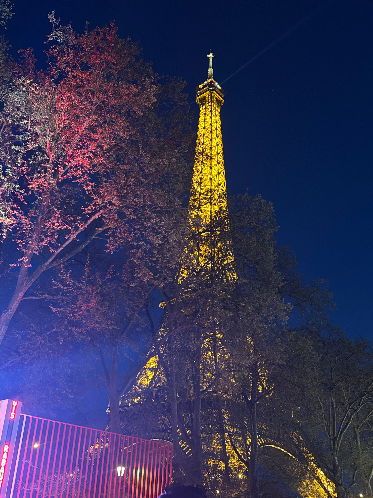 At night, the Eiffel Tower in Paris, France, stands illuminated in golden light against a dark blue sky. The tower's beam shines upward. Trees with green and red-tinged leaves frame the structure. Toβ¦read more