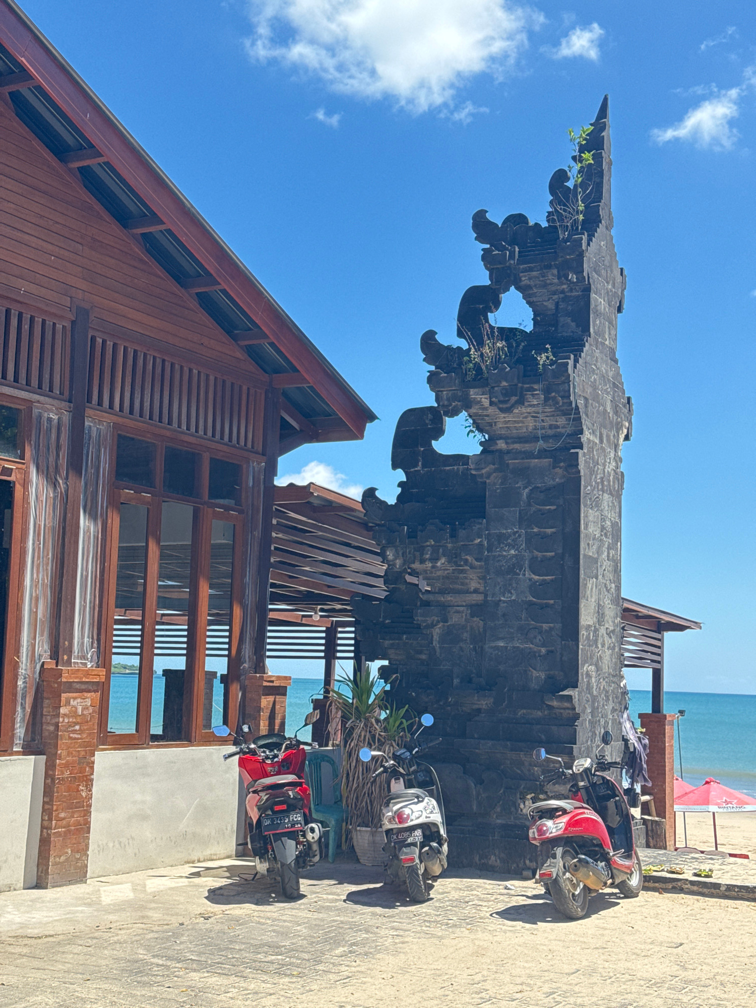 The image depicts a scene on what appears to be a beach in an unidentified city. A traditional Balinese stone gate structure stands prominently, featuring intricate carvings and weathered texture. Theβ¦read more