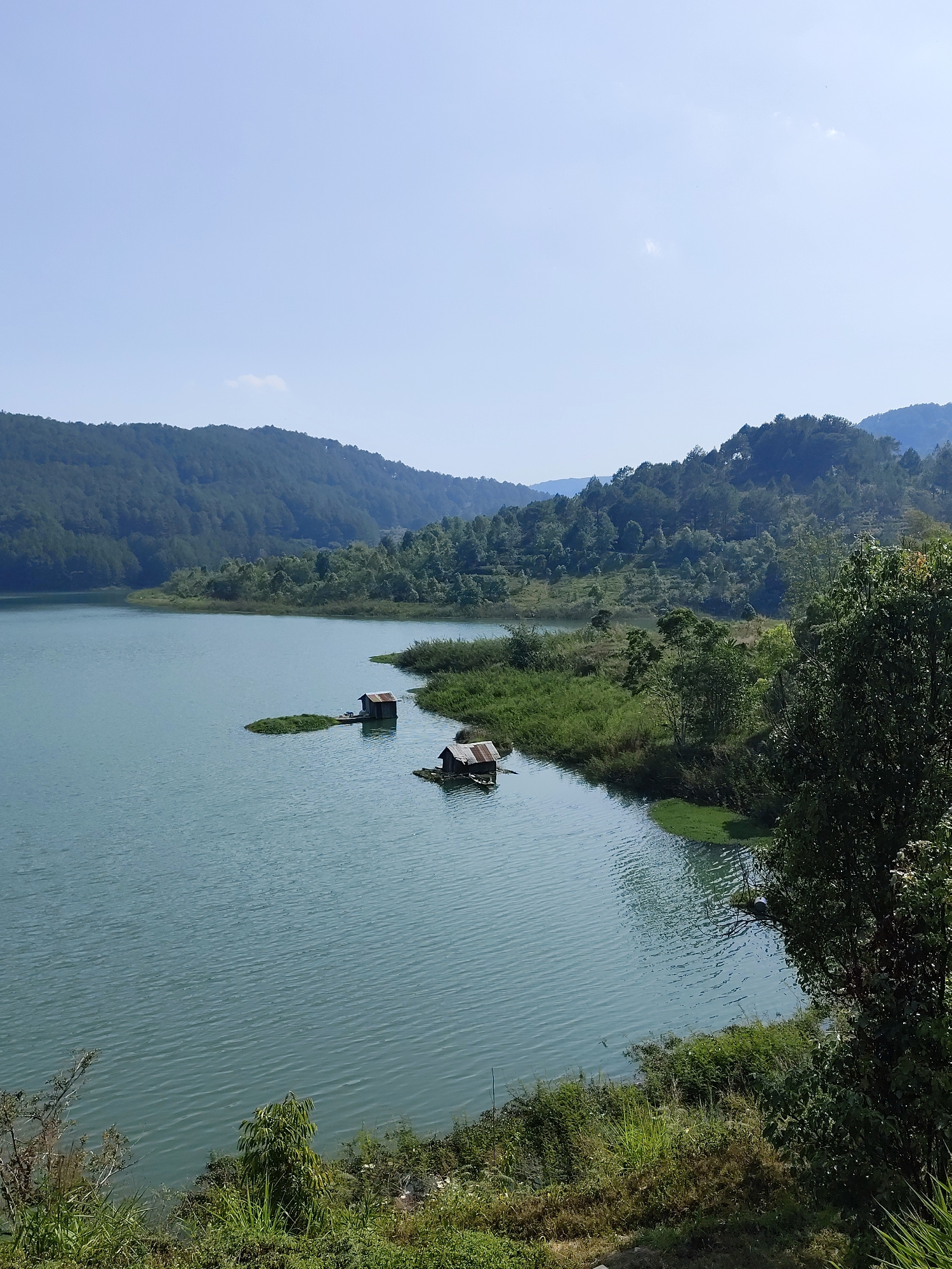 The image shows a wide, placid lake surrounded by lush green hills and trees. Two small, dilapidated wooden structures, possibly huts or fishing platforms, are floating on the lake's surface. The wate…read more
