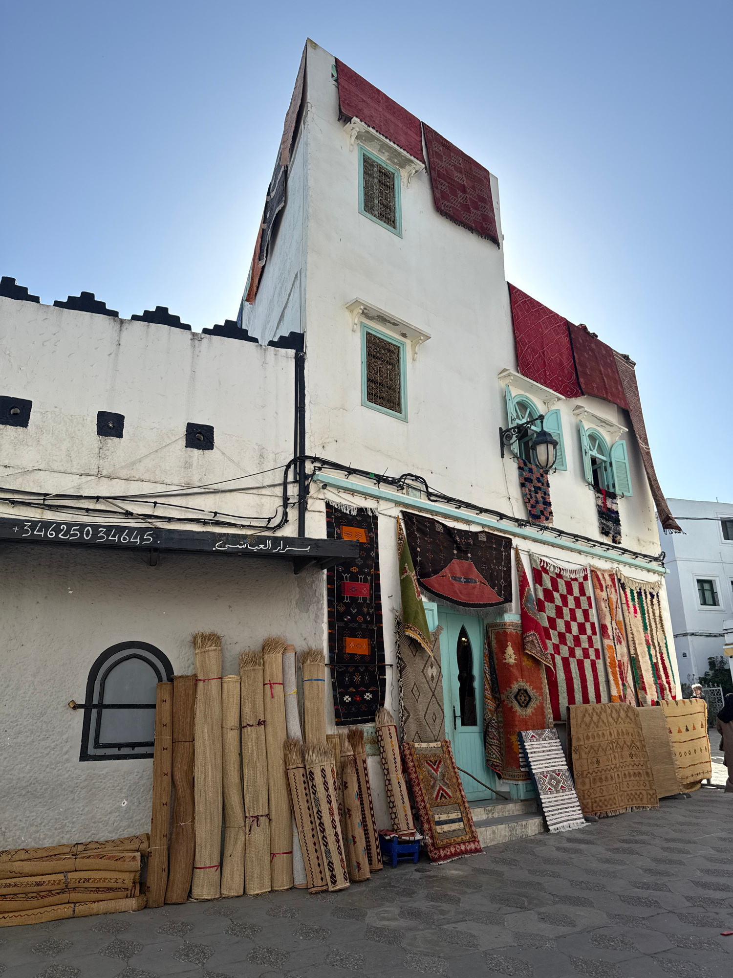 Captured from a low angle and rotated, the image portrays a sunlit building in Asilah, Morocco. The building's white facade serves as a display for a variety of rugs and carpets. The rugs come in diff…read more