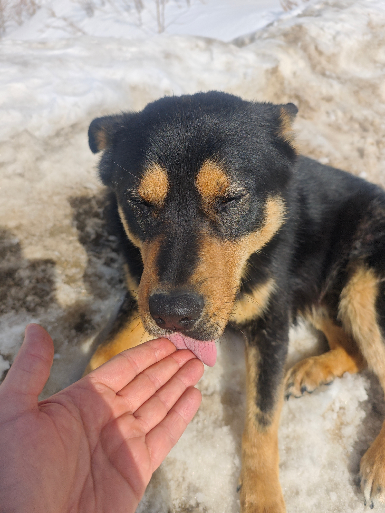 A close-up shot depicts a medium-sized dog with black fur and tan markings, its eyes closed, lying on a surface of compacted snow and dirt. The dog is in direct sunlight, and its tongue is extended, l…read more