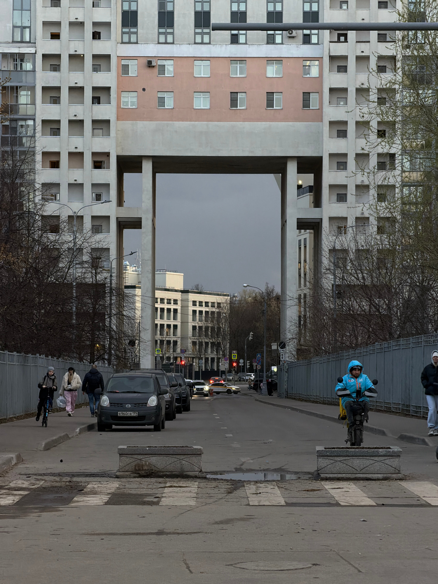 The image shows a street scene in Khimki, Russia, featuring a large concrete building with multiple open-air balconies on the left side of the frame. The building has a central section that appears to…read more