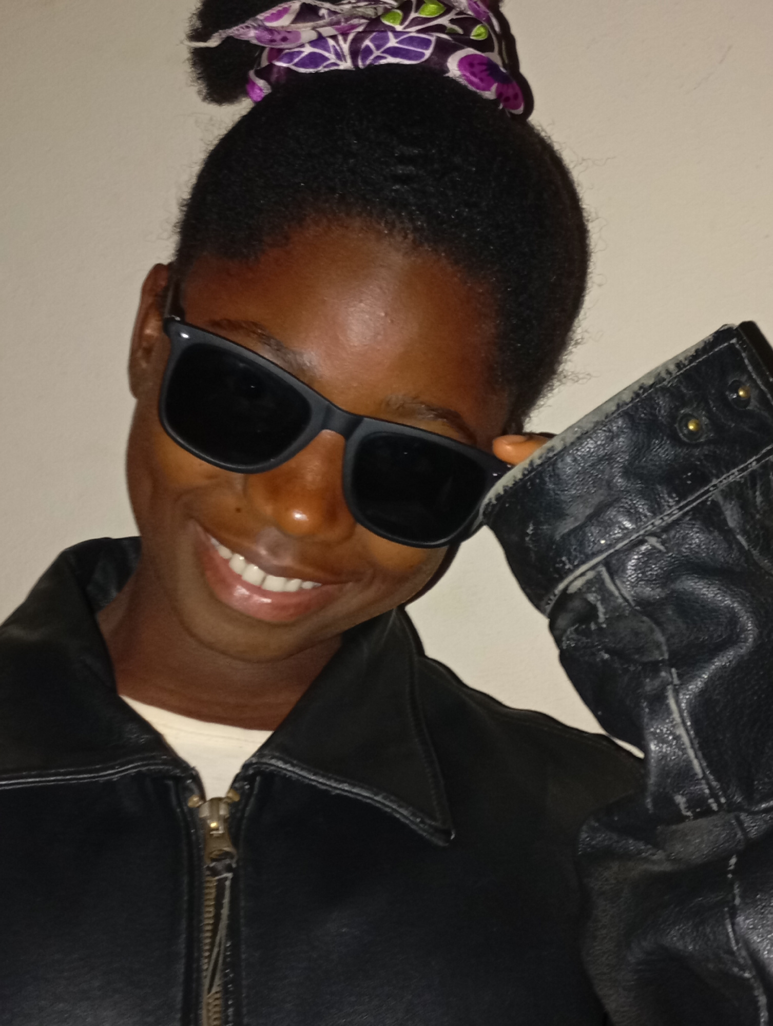 A young woman with dark skin is wearing black sunglasses and a black leather jacket. She is smiling slightly and has her hand near her sunglasses. Her hair is pulled back with a patterned purple and w…read more