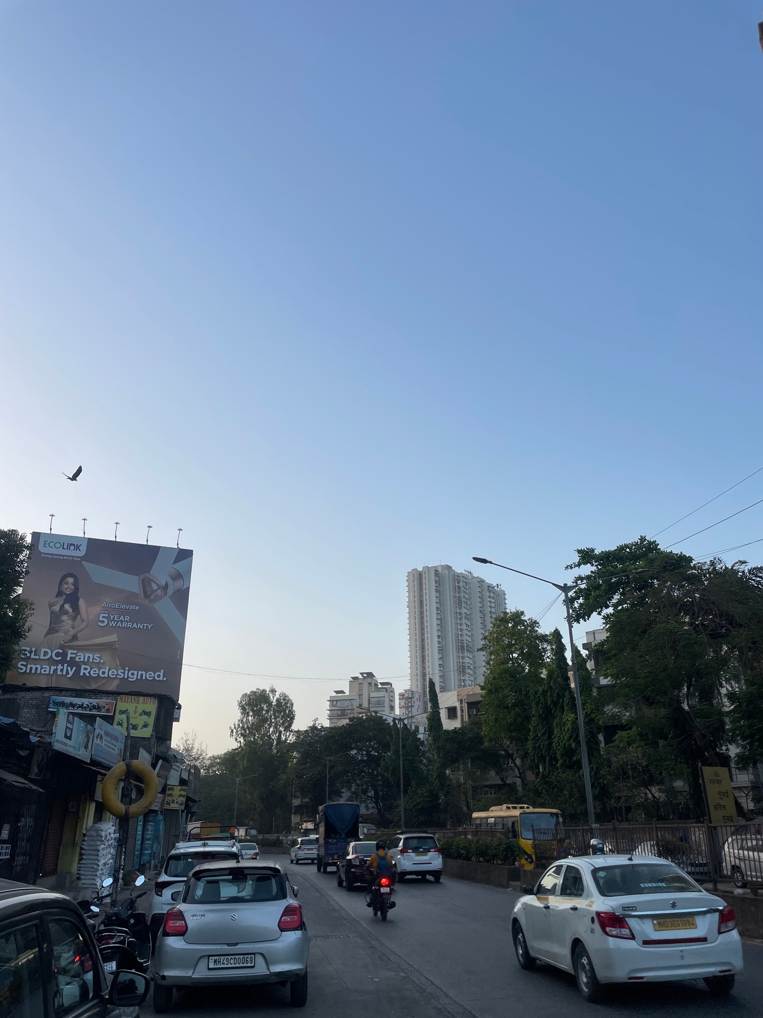 The image captures a street scene in Mumbai, India. The sky is a clear, light blue. On the right side of the frame is a row of parked cars, including a white Suzuki with license plate MH49CD0068. Moto…read more